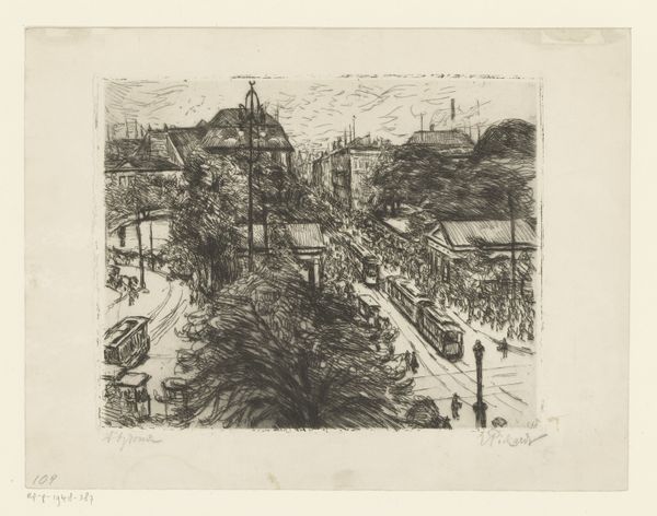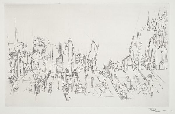 Salvatore Pinto created "The Pennsylvania Railroad", using etching techniques. The image presents an elevated view of a bustling cityscape intertwined with the industrial presence of a major railway. Made in the United States, the artwork encapsulates the early to mid-20th century, a period marked by rapid industrialization and urbanization. The Pennsylvania Railroad, a symbol of progress and connectivity, dominates the scene amidst the city's architectural landscape and smoking chimneys. The elevated perspective suggests a society forging ahead, with infrastructure literally rising above the older structures. Pinto’s choice of subject matter reflects the era's fascination with technology and its transformative power. The visual codes of industry and commerce are all here. To fully appreciate the art, one should study the era’s economic structures and urban development policies. Understanding these contexts enriches our view, and we see this artwork is more than just a picture, it is an insightful commentary on a society in transition.