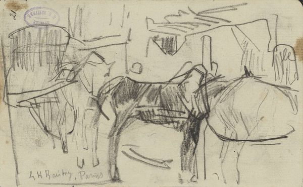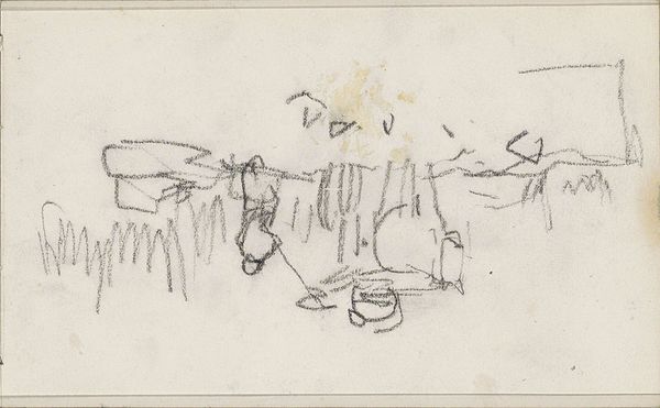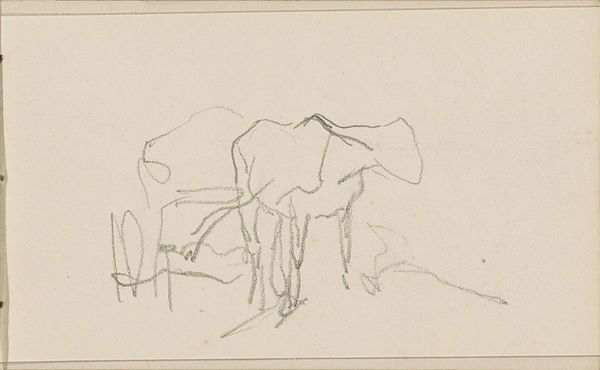 Editor: This is "Paard en wagen," or "Horse and Wagon," a pencil drawing by Anton Mauve, made sometime between 1848 and 1888. It feels unfinished, almost ephemeral, like a fleeting moment captured on paper. What do you see in this piece beyond just the initial sketch? Curator: Beyond the visible, this drawing offers a lens through which to examine the labor conditions and social hierarchies of 19th-century agrarian society. Mauve's choice to depict working animals invites us to consider their role not merely as beasts of burden, but as vital contributors to a system often exploiting both human and animal labor. How does this sketch, with its deliberate lack of detail, comment on the realities of rural life? Editor: I hadn’t considered the socio-economic implications. I was focused on the artistic technique, the spare lines suggesting form. So, you’re saying it's more than just a study of form? Curator: Precisely. The incomplete nature of the sketch perhaps speaks to the precariousness of the working class’s existence. This was a time of massive social upheaval; think about the rise of industrial capitalism and the displacement of rural populations. This image asks us: who are the invisible hands, or in this case, hooves, driving the societal machine? Editor: So, the sketchiness isn't just about the artist's process, it's a commentary on social instability? Curator: It could be interpreted as such. The image invites us to consider how art can subtly critique prevailing power structures, even within seemingly simple genre scenes. Think about the animal rights movements during the period and debates around animal labor, and the art begins to speak volumes. Editor: I never thought about sketches having such potential to discuss social issues! I usually see them as preparation or practice. Curator: And sometimes, they become powerful statements on their own. What has resonated most with you about how social awareness interacts with this image? Editor: That a fleeting impression can carry so much historical weight and trigger such interesting ideas about labor and power. I'll definitely look at sketches differently now! Curator: Indeed. Art is so much more than what meets the eye at first glance!