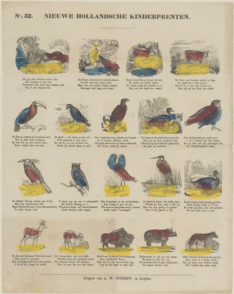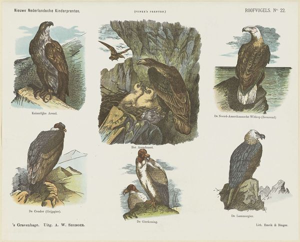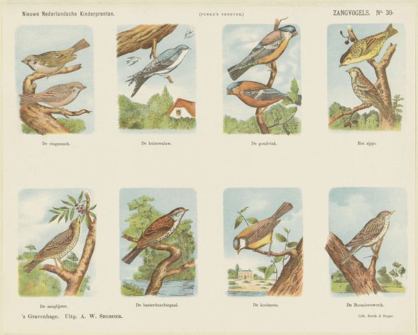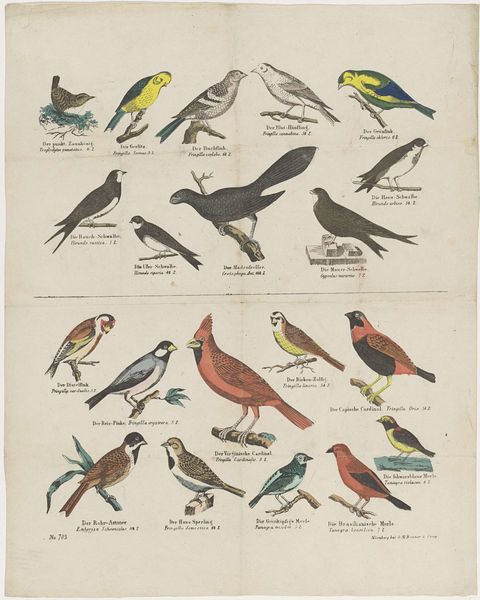 Editor: This lithograph from 1873, "Diergaarde / vogels," attributed to De Ruyter & Meijer, presents an array of birds, neatly arranged in rows like specimens in a natural history book. They appear scientifically categorized. How would you interpret the purpose behind creating something like this? Curator: Considering the period, the image served as both educational tool and a reflection of burgeoning public interest in natural history, amplified by increasing global exploration. These "Diergaarden," or zoos, were very much part of shaping public understanding of the natural world. What do you observe about how these birds are rendered? Editor: Well, they all seem very...clinical? They're each presented almost as isolated examples, and each of their names is right underneath them, almost like a guide book! Curator: Precisely. These were also tied to the emerging culture of print media; it was less about an aesthetic representation and more about documentation and classification made accessible to a wider audience. Note, too, that it normalizes a specific perspective - that of scientific observation. Who was this ‘wider audience’ then and who is the audience of this work now that it’s been recontextualized inside an art space? Editor: So, it's a form of democratized knowledge dissemination? And now it prompts us to think about the role institutions play in framing knowledge? Curator: Exactly. It allows us to think about how institutions categorize nature for our understanding – both back then and now. Editor: Fascinating to see how even a simple image of birds can reveal such a complex cultural narrative!