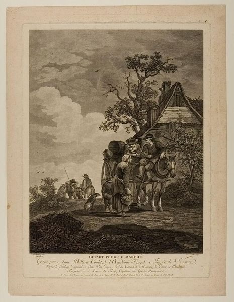 Anne Philiberte Coulet engraved this scene of rural life, titled "Départ pour le Marché"– Departure for the Market – sometime in the 1700s. It offers us a glimpse into the economic and social structures of 18th-century France. The image depicts peasants setting off to market, with goods loaded on a cart. Note the contrast between the relatively well-off figures on the donkey-pulled cart and the walking figures. The work subtly comments on the social hierarchy of the time, capturing the daily lives of those involved in agricultural production. Coulet was affiliated with both the Royal and Imperial Academies, suggesting the institutional networks through which artists circulated at the time. To fully understand this print, we need to consider the broader economic conditions that made the market such a central place in French society. Records from local archives, guild documents, and travel logs can all help us to reconstruct the world in which Coulet's image circulated, reminding us that art is always made within a specific set of social and institutional circumstances.