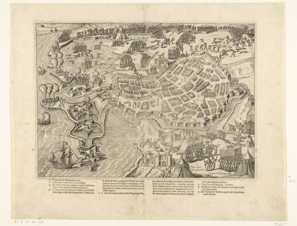Editor: Here we have an anonymous engraving from around 1621-1622, titled "The Conquest of Gulik." It looks like a bird’s-eye view of a battle scene, incredibly detailed despite being made only with ink on paper. All those tiny figures and fortifications give it a kind of frenetic energy, don't you think? What strikes you most about this piece? Curator: You’ve hit upon something key right away – the sheer density. It’s as if the artist wanted to capture *everything*, not just the battle but the very *idea* of conflict and conquest. Think about it: a bird’s-eye view wasn't exactly common for news reports back then. It lifts the event into the realm of strategy and destiny, doesn't it? Almost as if it's declaring the city’s fate. I am curious - do you sense the same dramatic effect when viewing this piece? Editor: I hadn't thought about it that way, but the overview does lend it an air of inevitability. The scale, or the simulation of scale, is vast, even if the individual figures are tiny. But where do you think the emotional heart of this work lies? Does it celebrate the victors or mourn the fallen? Curator: Ooh, excellent question! I suspect it's more about documentation than celebration. There's a cold, almost scientific precision in the rendering of the fortifications. Look how each individual tent in the encampments are drawn so accurately. We feel like impartial observers being handed a map. Almost as if the anonymous artist has recused themselves. What an idea. Editor: So, less a war cry and more of a… well, almost architectural rendering, wouldn't you say? This definitely challenges my initial, emotive reading. I’m rethinking what art *can* be. Curator: Precisely! Sometimes, art whispers when we expect it to shout, and reveals history in the subtlest of strokes. Always keep your eyes open, even to works without an apparent personal identity or clear motivation. Thanks for sharing insights today!