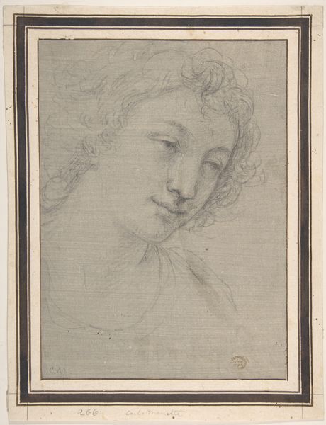 Curator: Well, just look at him, drifting somewhere far away. It feels like peering into someone's most intimate dreamscape. Editor: This drawing, entitled "The Head of a Young Man with Closed Eyes," comes to us from the hand of Francesco Furini. Created sometime between 1603 and 1646, it's a Baroque portrait rendered in pencil and colored pencil on paper. What strikes me most is its delicate rendering; the face emerges softly from the background. Curator: Soft is definitely the word. The colours are like whispers. There's something incredibly vulnerable in those closed eyes. You almost feel like you're intruding on a private moment. Do you feel that intimacy too, or is it just me being overly sensitive, as usual? Editor: No, not at all. The choice of drawing as a medium heightens that sense of intimacy. Unlike the grand gestures we often associate with Baroque painting, a drawing suggests immediacy, a private study almost. But it is interesting how the Italian Renaissance lingers here, as the idealized beauty and smooth, flowing lines still capture Renaissance ideals even as the dynamism of Baroque portraiture is embraced. Curator: The way the light caresses his face makes me think about the act of seeing, or rather, not seeing. He's turned inward, completely unaware of us observing him centuries later. Editor: The portrait allows access. I wonder, what was the intention? Was this preparatory for a larger painting, or perhaps a private meditation on youth and beauty? The Statens Museum for Kunst holding onto this work gives access to Furini, his skill, and, yes, intimacy to a large public audience. Curator: Maybe it was just a moment, you know? A fleeting feeling Furini had to capture. Thank you for pulling apart what makes this head really shine, I was in danger of losing myself. Editor: It's in holding the personal up against cultural understanding where we really bring context and the politics of imagery together.