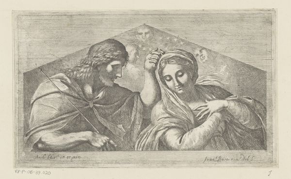 Curator: This is Peter William Tomkins's "Lot and His Daughters," currently residing here at the Harvard Art Museums. Editor: It has a somewhat somber, almost oppressive feel, doesn't it? The tight composition and heavy shading really amplify the unease. Curator: The printmaking process itself contributes to that, with the meticulous layering of lines and the emphasis on tonal contrast. Consider the labor involved in its creation, too. Editor: Absolutely. You can sense the weight of the narrative, the biblical burden—Lot's anguish, the daughters' desperation. It's all etched into their expressions, wouldn't you say? Curator: It's a potent reminder of how artistic techniques shape our reception of even the most dramatic of subjects. Editor: Indeed. It really leaves you pondering the human condition, doesn't it?
