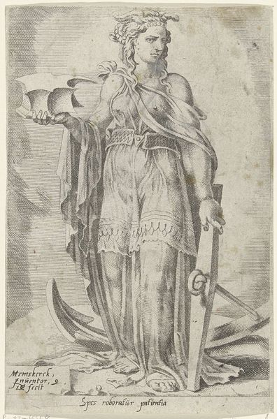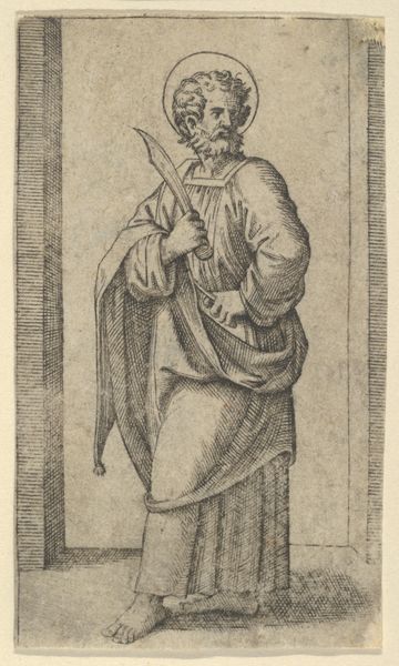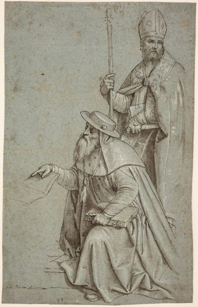 Curator: I find this ink and charcoal drawing of Saint Florian, likely dating between 1600 and 1610, quite striking in its tonal range. Editor: My first impression is a somber dignity. There’s a stillness about him, a melancholic heroism in the shading and line work. I can't help but see him as a symbol of resilience amidst chaos. Curator: Notice how Turchi uses the charcoal to build up the figure, concentrating density around the armor and the face, especially the curls framing it. We also see the type of paper itself informing how the charcoal manifests. It creates texture. Editor: Right, it's impossible to divorce the art from its production. And this paper would have been a valuable commodity! Who would have had access to art making at the time? The figure himself radiates privilege but also resonates with the historical Florian, a Roman army officer who, like so many figures, stood up against state power, challenging imperial decrees and, ultimately, giving his life for his beliefs. The symbolism resonates profoundly within our current struggles against oppression. Curator: Precisely. Consider, too, how the artistic workshops of this period operated. Assistants often worked on preparatory drawings. Was this created within a larger system of labor? Was the Saint Florian character a figure of resistance that made visible and empowered those who could be described as laboring invisibly at the time? The presence of that bird reminds me of the dove, an age-old signifier for the Holy Ghost. What do you make of its connection to the Saint? Editor: To me, the bird reads as an invocation of freedom, a refusal to be constrained by earthly powers. It could reference how faith enables action. We are, of course, engaging in a long and important discussion, in terms of historical accuracy, the relationship between a historical army figure, Saint Florian's alleged faith, and the meaning of that faith, but regardless of that complex conversation it suggests to me the deep interconnections of faith, political expression, gender expression, race, and economics. It can be very tempting to dismiss a period or a theme such as 'religious art' for its lack of...relevance. Curator: Fair enough, but to bring it back to the artmaking… I am really impressed with the artist’s process in developing those intricate layers to realize Saint Florian as he comes to life before us. It reveals so much intention and purpose. Editor: Yes, it’s important to view these older artworks with contemporary eyes and questions, pushing beyond traditional readings to unveil their continued potential for dialogue and resistance. I can appreciate Turchi's craftsmanship. Curator: Well said, I will certainly be seeing Turchi's materials in a different light from now on!