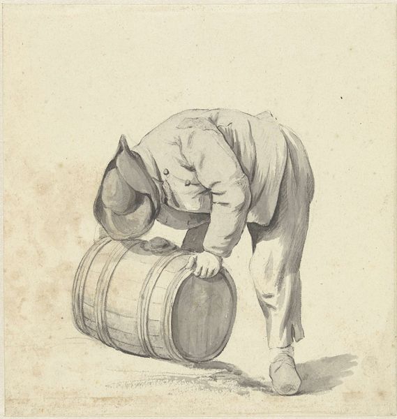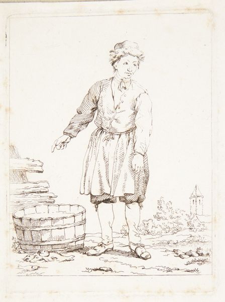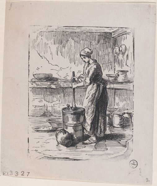 Editor: So, this is "Woman Filling Water-Cans," an 1854 print by Pierre Millet, done with ink on paper, and housed here at the Art Institute of Chicago. There's something so incredibly simple about the composition, almost stark, but it evokes a quiet dignity, you know? What strikes you when you look at this piece? Curator: Quiet dignity... I love that. It's more than just a woman fetching water, isn’t it? Think of Millet wandering the fields, pencil in hand, drawn to the elemental rhythm of daily life. The way he uses the ink – so spare, so deliberate – feels like he’s distilling the very essence of labor, transforming the mundane into something almost sacred. It whispers of France's transition. Do you feel the rumblings of the Industrial Age here? Editor: I can definitely see the tension now that you point it out – that romantic ideal of rural life on the cusp of disappearing. It makes you wonder what Millet thought about the changing landscape. Did he idealize the peasant life, or was he simply documenting it? Curator: Perhaps a little of both. There’s a deep empathy in his observation, but also, I suspect, a touch of longing. He's showing us not just what is, but what might soon be lost. Notice how the light seems to cradle her form, elevating her into a symbol. Do you get a sense of nostalgia from that? Editor: It's amazing how a simple ink drawing can contain so much. I initially just saw a woman fetching water, but now it’s so clear there's something deeper going on. It's like Millet is using the everyday to touch upon the eternal, if that makes sense. Curator: Precisely. It's a dance between the concrete and the abstract. Maybe we all could try doing that a bit more, finding beauty and meaning in our own everyday, transforming ordinary moments. That sounds like a lovely experiment, don't you think?