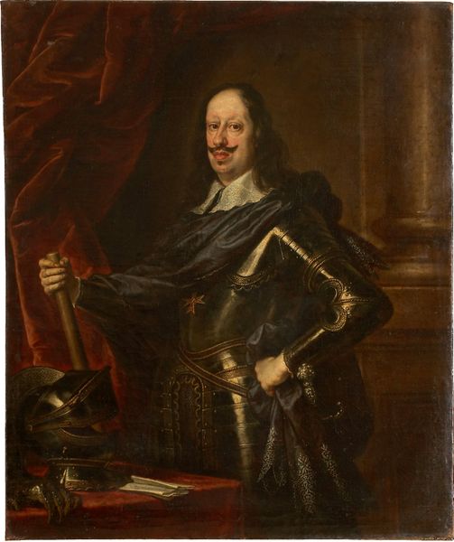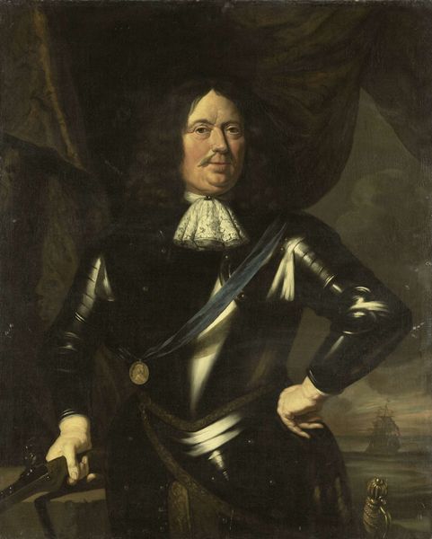 Curator: Here we have a portrait believed to be of Vice-Admiral Aert Van Nes, painted in 1667 by Ferdinand Bol. It's a classic example of Dutch Golden Age portraiture. Editor: It has such a striking calmness, doesn’t it? Even though it feels very much like a formal portrait, there’s something quite intimate about the gaze and stance. He’s authoritative, but also relaxed. Curator: Absolutely. Bol was working within a tradition where representing status was paramount. Notice the architectural element of the pillar behind him—it grounds him in the realm of stability and importance. These men were pillars of Dutch society during a period of great power. Editor: The sword, of course, also contributes to this, but look closer – the hilt isn’t prominently displayed; instead, the viewer's attention is brought to this incredible sash! That cinched waist definitely speaks of military preparedness but what about masculine allure as well? Curator: The sash is indeed wonderfully painted, all highlighted textures of interwoven cords. A bit of flair amongst the sobriety one usually expects in these commissions. His gaze too meets ours. In the social context, this direct engagement was significant – the man is literally showing that he sees you. He’s acknowledging the power dynamics at play. Editor: The gaze holds tremendous psychological weight! Bol knew what he was doing. Every fold and accessory speak of power – social and individual. These men were literally and figuratively dressed to convey status, both by themselves and by their culture. And speaking of "folds and accessories," what could that neckcloth and flowing, curled locks possibly be trying to communicate to the viewer? Curator: And the controlled environment where these portraits were displayed shaped the viewers reception of the portraits themselves. The works hung in the sitter's private residences or council meeting rooms: a carefully managed mise-en-scene! These paintings contributed towards bolstering cultural myths about mercantile competence. Editor: Exactly, myths made possible because visual iconography gave these "ordinary men" the look of deities, literally placed on pedestals for continuous veneration by family, staff and foreign envoys! A true performance. Curator: Ultimately, Bol captured more than just a likeness; he immortalized a powerful figure at a crucial moment in Dutch history, showcasing how art served to legitimize the elite. Editor: It’s incredible to see how symbols and visual cues in the work carry a significance even today, centuries later. A visual reminder of how carefully crafted the Dutch self-image could be.