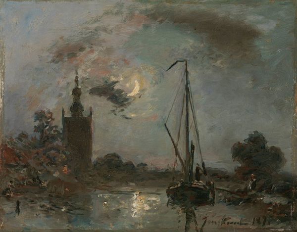 Johan Barthold Jongkind captured this evocative night scene, Clair de Lune sur un Canal, Dordrecht, using oil on canvas, during a time of significant industrial and social change in Europe. Jongkind, a Dutchman working in France, was deeply influenced by the Hague School of painting, which sought to capture the mood and atmosphere of the Dutch landscape. In this painting, the moon casts a gentle glow over the Dordrecht canal, illuminating the boats and surrounding architecture. Canals were the lifeblood of Dutch commerce and society, and the quiet stillness of the scene evokes a sense of the Netherlands' rich maritime history. Jongkind wasn't interested in documentary accuracy, but rather in conveying a feeling. Although a man, Jongkind was known for his sensitive and nuanced approach to painting, an approach that ran counter to the prevailing masculine ideals of the time. Through his emphasis on mood and atmosphere, Jongkind invites us to contemplate our own connection to the natural world and our place within it.