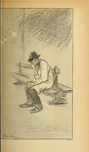 "La Chanson Du Pauvre Chanteur" is a drawing by Théophile Alexandre Steinlen whose intricate crosshatching shapes a poignant scene dominated by somber tones. This monochromatic palette and dense network of lines create a visual texture that evokes a sense of melancholy and introspection. The formal structure of the drawing emphasizes a figure hunched in what appears to be a graveyard. The lines, etched deeply, seem to delineate not just forms but also feelings of grief and resignation. Steinlen uses line to capture the weight of sorrow and the hard realities faced by the marginalized. The overall composition functions as a visual lament. The semiotic interplay here is stark, the graveyard setting and downcast figure act as signs that tap into a broader cultural understanding of loss and despair. This drawing invites us to consider how Steinlen uses formal techniques to not just represent a scene but also to engage with profound social and existential themes, echoing the era's broader philosophical leanings towards existentialism and social critique.
