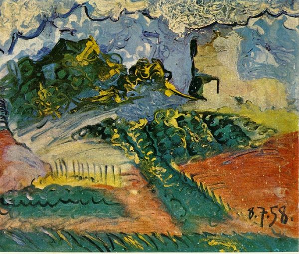 Editor: This is Van Gogh's "The Fields," painted in 1890, with oil paint. The churning sky and the heavy application of paint – the impasto – makes me think about the labor involved in both farming the fields and creating the artwork. What catches your eye about it? Curator: For me, the intense materiality speaks volumes. Look at how Van Gogh uses the oil paint, almost sculpturally, to depict the fields and the sky. It's not just about representation; it's about the very physicality of the labor and materials. Consider how the process of making mirrors the act of tilling the soil. Editor: That's interesting. It's almost like he's mimicking the farmer's actions with his brushstrokes, showing the raw energy involved. Does the setting affect how you perceive its materiality? Curator: Absolutely. Van Gogh painted this in the asylum at Saint-Rémy. The field is no longer simply a field; it's the object of labor and of viewing and also a raw resource converted through strenuous production of art and grain. Editor: It is a very confined picture space though. I wouldn't have immediately thought of an asylum based on the subject. The horizon feels a long way away... Curator: And yet, it does. The low horizon, along with his visible labor, makes me wonder how he regarded the working people from this area in France. Is it about documenting a landscape, or a reflection on its people who sustain it? The labor involved is inherent in both production and how we should interpret Van Gogh’s work. Editor: I hadn't considered that perspective before, thank you! Seeing the art this way encourages you to connect to labor practices outside the subject and production. Curator: Indeed. Considering materiality and production opens so much about social structures and the labor inherent to both art and society.