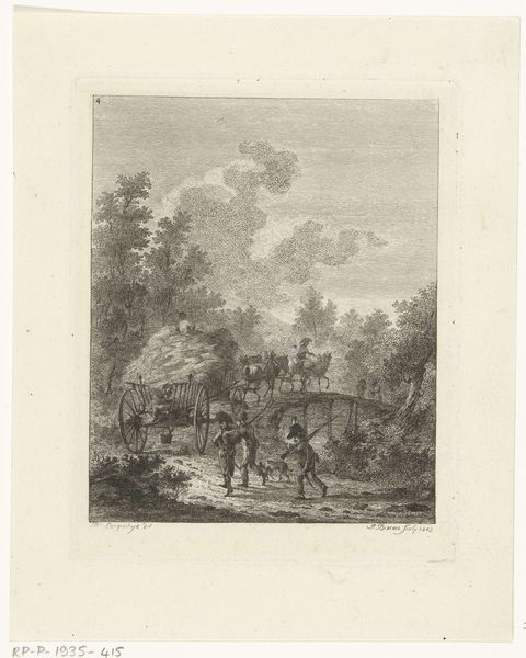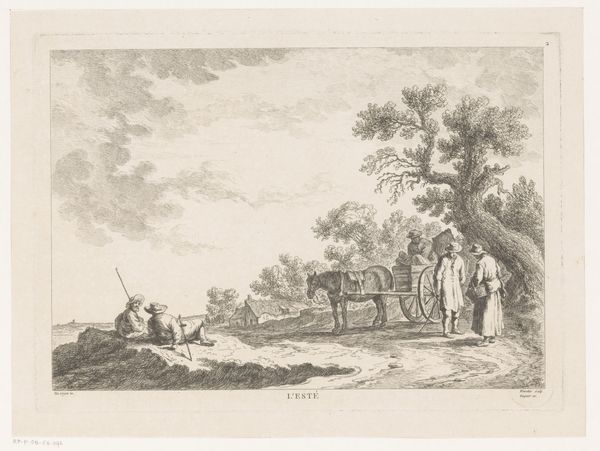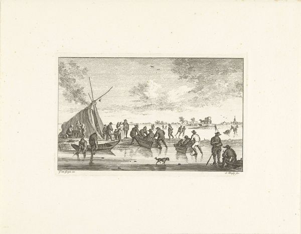 Johannes Arnoldus Boland created this print, “View of a Village on a River,” using etching techniques. The composition invites you into a serene yet detailed world, where the textures of water, foliage, and architecture merge to create a harmonious scene. Boland masterfully uses line and tone to construct depth. Notice how the intricate cross-hatching defines the cloudy sky and the rippling water, giving them a palpable sense of movement. The strategic placement of dark and light areas guides the eye from the bustling riverbank to the tranquil village nestled among trees. The structure of the image balances human activity with natural elements, suggesting a symbiotic relationship. The church spire, subtly placed, anchors the village and perhaps implies a moral or spiritual center. Yet, it's the textures and meticulously rendered details that truly capture the essence of this tranquil scene, inviting you to contemplate the interplay between nature, culture, and human presence. This etching offers a window into a world where every stroke contributes to a larger, cohesive vision.
