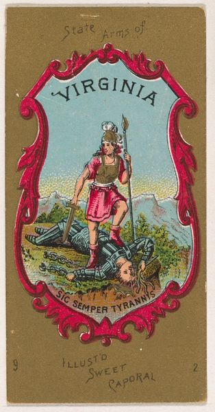 Editor: Here we have *Bow Gun*, a print created in 1887 by Allen & Ginter for their cigarette brand series "Arms of All Nations." It looks like a playful take on weaponry – a colorful little scene with a bowman aiming at a miniature, perhaps an impish rival, in the background. The color palette is cheerful, reminiscent of a vintage storybook. What leaps out at you when you look at this image? Curator: Oh, I love where your mind is going! For me, it's all about the *wink*. These cigarette cards, you see, were little explosions of visual information in a pre-internet world. Allen & Ginter weren't just selling tobacco; they were peddling exoticism and knowledge! This particular card strikes me as humorous. A strapping Robin Hood facing off against what? A gnome with an attitude problem? It reminds us not to take everything so darn seriously, even our own 'arms'. Editor: I didn’t really think about the cultural context of a cigarette card before; the gnome didn't even register with me! Is there a deliberate juxtaposition going on? A suggestion that conflict itself is rather silly? Curator: Perhaps! Or it might simply be playing into a larger trend of exoticism and collecting the unfamiliar. Ukiyo-e prints also come to mind, though far less refined in style. Consider what a bizarre juxtaposition this image is for a promotion aimed at tobacco. Do you imagine it influencing someone to purchase the product? Editor: Now that I’m thinking about the cigarette tie-in, it gives a darker, almost manipulative feel to the cheerful colours and silly subject matter, though at least, hopefully, these cards have found a much better and safer home, tucked away inside museum walls! I hadn't appreciated the layers lurking beneath this playful exterior. Curator: Exactly! Art is like that, isn't it? A conversation across time, sparking new insights with every glance.