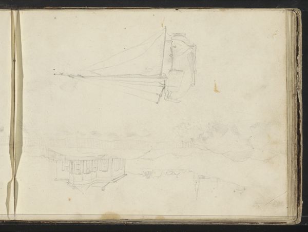 Curator: We are looking at a drawing titled "Landschap met een molen en boerderij aan een vaart," or "Landscape with a Mill and Farm on a Canal," by Cornelis Pronk, created around 1728-1732. It’s currently held at the Rijksmuseum. Editor: It has such an ephemeral quality! You see the swiftness of the line work – this really feels like catching a moment. The rawness emphasizes the hand and the quick gestures involved in its making. Curator: Indeed. Pronk employs a deliberate economy of line. Note how he defines form and space through subtle variations in pressure. Look closely at the windmill, how he indicates the structure with very minimal strokes. Editor: And consider the paper itself. You can practically feel the weave of the page, that material foundation beneath the artist’s fleeting impressions. I imagine this sketch existed to create other work; the grind of the mill and farm representing the source and toil, labor, the actual substance. Curator: Precisely. The materiality is interesting—Pronk uses the whiteness of the paper as negative space, making it an integral part of the composition. Notice how he leaves large sections untouched. It draws the eye towards those very light yet descriptive marks that define the farm structures. Editor: And there’s a kind of quiet defiance, isn’t there? An embrace of utility rather than polished finish. Pronk reminds us that art springs from action, and material interactions—that these forms come from someplace and are connected to greater social production. Curator: Absolutely. It reveals Pronk’s ability to synthesize observation and conceptual rigor. Through careful assessment of planes and proportions, the artist doesn't merely depict architecture. He creates a structured viewing experience. Editor: I agree; examining it more closely has moved it past just lines on a page. It is something connected more intrinsically to how labor shaped Dutch society during its Golden Age. Curator: Well, it makes me reconsider how much information an artist can suggest using just a few well-placed marks. Editor: And for me, it stresses how even a preliminary sketch captures a whole story concerning materiality, method, and manufacturing.