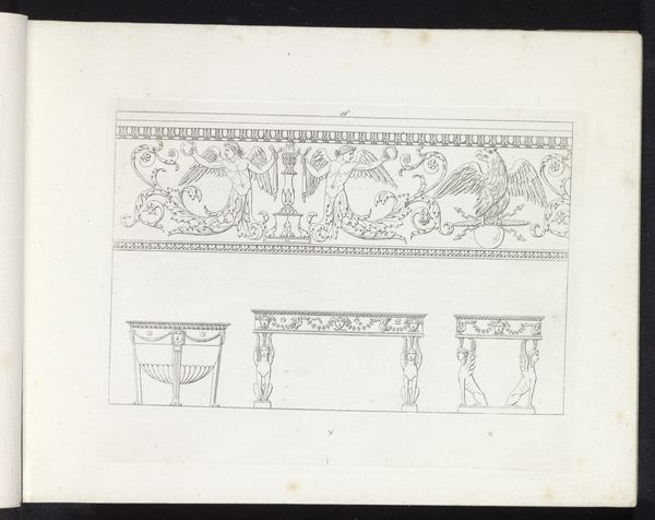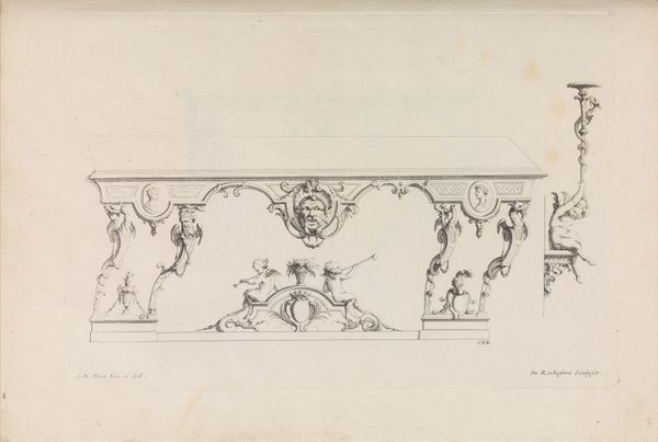 Jean Bernard Toro made this print, Livre de Tables de Diverses Formes, in the early 18th century, using etching. The image depicts a design for an elaborate console table and wall sconce, brimming with ornamentation in the Régence style. Etching, like engraving, is an indirect intaglio process. A metal plate is coated with a waxy, acid-resistant substance called the ground; the artist scratches an image into this ground, exposing the metal; the plate is then immersed in acid, which bites into the exposed lines. It's a process that allows for highly detailed, precise designs to be transferred onto paper, facilitating the rapid dissemination of visual ideas. Prints like this one were crucial in spreading new styles and decorative motifs across Europe. This print offered a template, a set of instructions almost, that would have required a whole team of skilled artisans to execute. It highlights the collaborative nature of design and production during this period, where individual creativity intertwined with collective labor and craftsmanship.