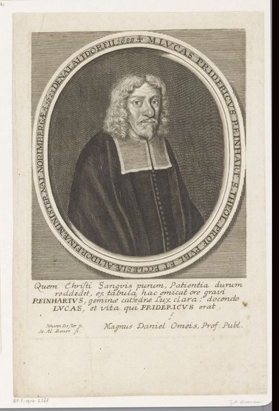 This is Christian Fritzsch’s portrait of Gustavus Herdman at 75, an engraving on paper now held at the Rijksmuseum. Notice how the composition is structured around a play of geometric forms. The oval frame, filled with text, contrasts with the rectangular base, creating a visual hierarchy that draws our eye from the inscription upwards to the sitter's face. Fritzsch masterfully uses line and texture to convey Herdman's character and status. The precise hatching defines the contours of his face and beard. It simultaneously models the folds of his garments, giving depth and weight to his figure. The formal arrangement speaks to the values of the time, where reason and order were paramount. The portrait uses semiotic codes to communicate Herdman's identity and social standing. The Latin text and the orderly composition reflect the period's intellectual and cultural climate, framing Herdman within a specific historical narrative.