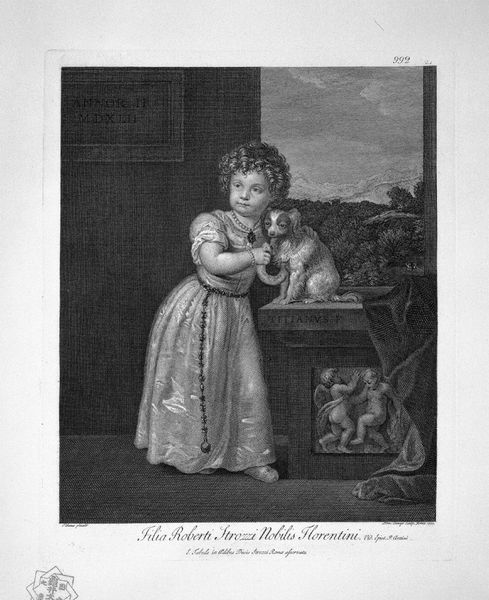 Editor: This is Francesco Bartolozzi's "Philip Yorke," currently housed at the Harvard Art Museums. It feels so sentimental, like a snapshot of childhood innocence. What can you tell me about its context? Curator: It's interesting to consider how Bartolozzi, an engraver, disseminated images of elite children like Philip Yorke. How did this imagery function in constructing ideas of class and childhood in the public sphere? Editor: So it’s more than just a cute picture, it's a statement? Curator: Precisely. These images played a role in shaping social perceptions and hierarchies. Notice how Yorke's connection with nature and animals reinforces an ideal of pastoral gentility. Editor: I never thought about it that way. Thanks! Curator: It reveals how art is always embedded in social and political narratives.