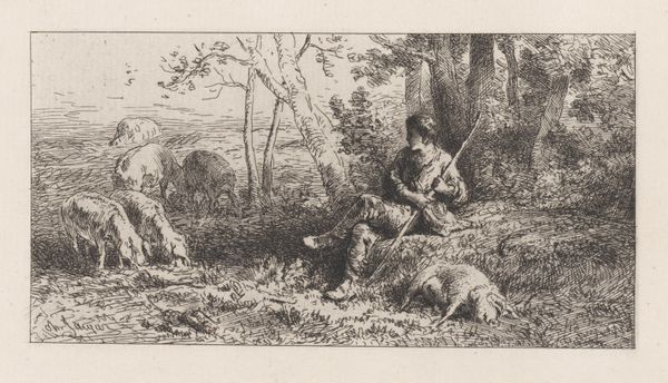 Editor: Here we have Charles Jacque’s etching "L'Enfant Prodigue," created between 1863 and 1873. There's a quiet solemnity in the lone figure overseeing the grazing sheep that's really compelling. How do you interpret this work, especially given its title? Curator: Well, immediately, "L'Enfant Prodigue" translates to "The Prodigal Son." Given the social and religious contexts of the 19th century, depictions of biblical narratives served didactic functions. However, Jacque’s landscapes are deeply rooted in the Barbizon school, which valued naturalism over idealized, grand narratives. How might we understand the collision of these traditions, and the implied political meaning of such a shift? Editor: That’s interesting. So, instead of focusing on the moral redemption aspect, is Jacque perhaps emphasizing the son's connection to the land after his period of indulgence and disconnect? The vastness of the landscape could be indicative of a return to simpler, perhaps more authentic values in opposition to rapidly industrializing urban spaces. Curator: Precisely. Consider the rise of landscape painting and its audience during this period, increasingly made of of a rising bourgeoisie shaped by social and economic transformation. By placing the biblical story within this natural setting, Jacque is imbuing the landscape with a kind of moral authority, setting it up, implicitly, as a place of salvation away from urban spaces. Do you think he idealizes rural labor in this version? Editor: Maybe…there's an undeniable sense of peace in the composition. The absence of the traditional feasting scenes we're accustomed to certainly directs focus elsewhere, lending to what might be construed as pastoral escapism. Curator: I think the narrative and visual components subtly push and pull against each other in this case, reflecting social tensions during that historical period. Jacque appropriates and reframes traditional didactic imageries, reflecting shifting cultural values Editor: I appreciate how thinking about the landscape as a social space reframes my understanding. Curator: Indeed. Historical context invites nuanced interpretations of Jacque’s piece and illuminates the complexities of artistic creation and reception in relation to social changes.