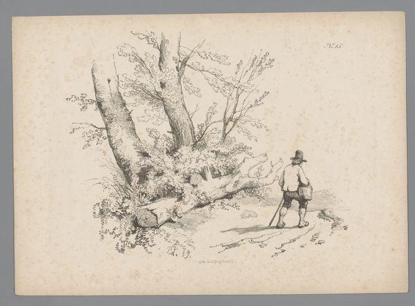 Here is the original image: This graphite drawing, "Bos van Fontainebleau en politieman," was made by Gerrit Postma and is currently housed in the Rijksmuseum. The composition is split between a tranquil forest scene and a solitary policeman, rendered with delicate lines. Notice how the soft, almost ethereal treatment of the forest contrasts with the sharper delineation of the figure. The policeman is rigidly posed and appears to be a symbol of authority. The artist juxtaposes nature and civilization; the looseness of the forest scene versus the constraints of human order. The sketch implies a subtle commentary on the interaction between man and nature, law and freedom. The empty space around the figures and landscape adds to the work's structural complexity. It allows the viewer to engage in a visual dialogue, questioning the relationships and meanings embedded within the composition. The drawing encourages viewers to reflect on how the artist uses form and structure to communicate complex ideas about society and the natural world.
