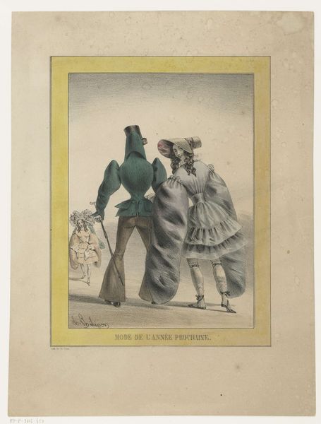 Curator: So, here we have "Man flirting with woman," a drawing by Charles Philipon, likely created between 1821 and 1828, crafted with ink and pencil on paper. It's currently held at the Rijksmuseum. Editor: My first thought? It’s lighthearted, a touch cheeky, isn’t it? All pastel shades, a frilly skirt. Curator: Philipon was a key figure in the development of caricature and political satire, particularly in France. Given that context, it’s fascinating to consider the piece within the broader socio-political landscape of post-revolutionary France and its shifting gender dynamics. The emphasis on the woman's elaborate fashion choices points to evolving class structures and social codes, as material displays reflected status. Editor: Absolutely, though the artist’s got a playful hand – that almost exaggerated tilt of the man's head! I find the drawing style disarming, almost sweet, which kind of pulls you in before you start unpacking the deeper meaning. Is that wardrobe symbolic, almost overflowing with hats and fripperies? Curator: Precisely! You might also note that in the background there appear to be a group of men, gathered at a table, almost obscured by a wall with hats, looking, it seems, towards this central pair, who seem caught up in their exchange, heedless to social conventions or expectations. It allows a social critique of gendered roles, highlighting the performativity inherent in courtship and social interaction within a particular historical moment. Editor: It makes me think of performance, really, everyone playing a role. Look at the guy's little pointed shoe, as he strikes a pose! It’s less of a heavy-handed criticism and more like a wink, inviting the viewer into the joke. It does make you think, though, about how much of flirtation—then and now—is shaped by social expectations. Curator: It underscores the work’s enduring relevance, how such art offers an insight into past eras and remains powerful in understanding our social norms today. Editor: Definitely. This is not just a snapshot of the past but an amusing, thought-provoking reflection in our own lives.