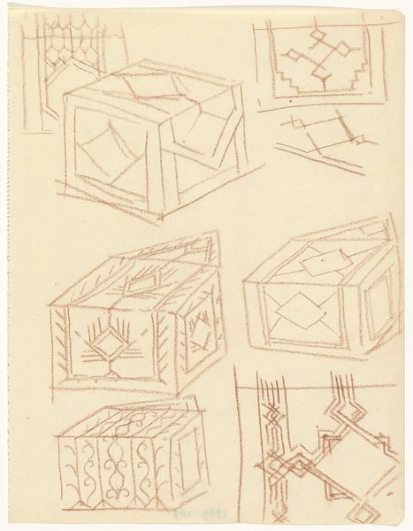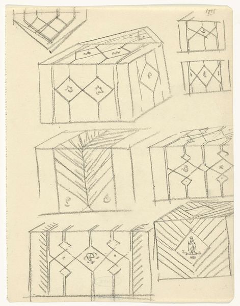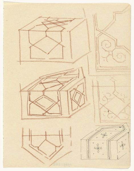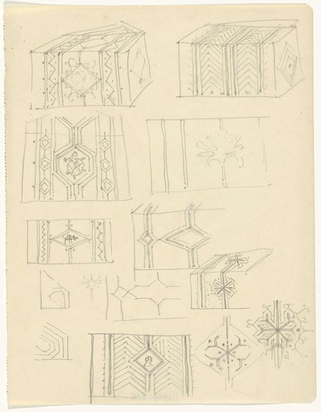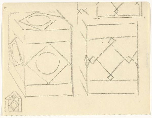 Curator: We're looking at "Ornamentontwerpen op blokken," a pencil drawing made by Gerrit Willem Dijsselhof, likely between 1876 and 1924. What strikes you first about it? Editor: There’s a delicacy to these geometric forms. Despite being pencil sketches, they evoke a certain architectural monumentality, almost as if Dijsselhof is sketching miniature temples. Curator: Absolutely. Knowing Dijsselhof's artistic trajectory, steeped in late 19th, early 20th-century art, one sees how ideas regarding craft, architecture, and societal ideals all came together in the ornamental design. How do you think this fits in? Editor: Ornament always speaks to a desire for meaning, wouldn’t you say? Dijsselhof gives us something more than pure abstraction: geometric frameworks are layered to recall symbols. The cube as the physical symbol for foundations can take a psychological shape as our human connection to something solid, perhaps also echoing Freemasonry concepts. Curator: The question is, for whom? Dijsselhof lived during intense changes in class and gender relations, and ideas around design had implications in class division. Consider the ways craft was valued—or not—and the social values associated with it. What did this symbol mean for the working class, and what implications are there in applying geometry to ornamentation? Editor: Well, given that Dijsselhof moved to designing furniture, I think there’s some democratizing urge at work, a way of giving everyone access to beautiful and historically laden form. I wonder whether the shapes evoke cultural memory even when not immediately decoded. Curator: That act of enfolding history within something we interact with daily seems vital, even revolutionary. To imply it would be beautiful is a fascinating theory. Editor: It does bring something forward regarding that time frame in history, where those architectural memories meet the more human element in design in the social era. Curator: I agree. It gives insight into a social movement when ideas were very different from what we embrace now, which allows viewers to ask these questions. Editor: An invitation for a deep delve into history through everyday things.