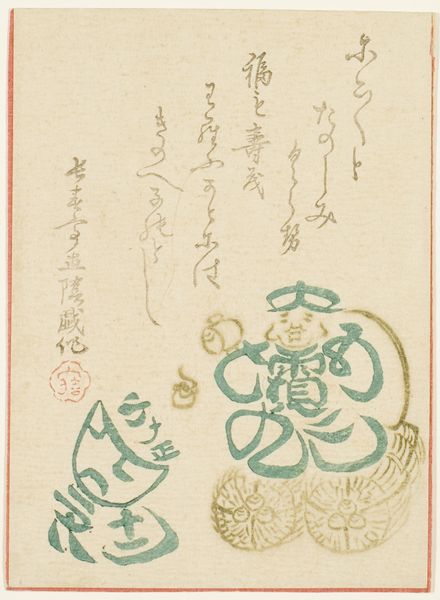 This small woodblock print depicts young pine trees and a ceremonial crown, made by an unknown Japanese artist. The print gives us insight into Japanese cultural traditions and aesthetics, particularly those related to childhood and celebration. With sparse lines and soft colors, the image evokes a sense of serene contemplation, a scene from a Shinto ritual. The presence of the young pine trees on a stand, along with the ceremonial crown, suggests a focus on prosperity, longevity, and the well-being of children. The garlands are especially striking. They combine elements of Shinto rituals with familial celebrations, reflecting a blend of religious and cultural customs centered on the hopes for the next generation. This piece can be viewed as a meditation on tradition, heritage, and the intimate connections between family, ritual, and identity. It also captures the ephemeral and emotional resonance found in the celebration of life's milestones.