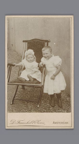Editor: This daguerreotype, titled "Portret van twee onbekende kinderen bij een tafel met serviesgoed," or "Portrait of two unknown children at a table with tableware" was taken by Max Cosman sometime between 1891 and 1903. There's such a solemn feel to it; the children look so serious. What stands out to you in this piece? Curator: The first thing that strikes me is how deliberately posed the subjects are, arranged with a table that itself holds carefully positioned objects. Note how this small domestic still life, juxtaposed with the children, speaks volumes. A stark cup, presumably a prop, serves as an icon of domesticity – but of whose home? And for whom are these children posing? The careful composition implies a desire to create a lasting impression, a cultural memory of innocence framed by societal expectation. Editor: It's interesting how you mention the posed nature, making me think of how people presented themselves for photography. Curator: Precisely. What emotional residue does their presentation evoke in you? Editor: I guess sadness. You want to know who they were. Their story. I wonder, does the presence of the table set for tea mean something specific for that time, beyond just showing middle-class life? Curator: Consider tea service as a stage—an icon of propriety. The performance of gentility. But do these children willingly participate, or are they merely actors within a cultural script? Look closely; do you see reluctance in their gaze, a quiet resistance to the symbols imposed upon them? Editor: I think I do, actually. Maybe there is something unnerving about the idea of performing for posterity, especially forced on children. Thanks, I’ll remember that when viewing other photography of this era. Curator: And I shall remember to look closer at those silent symbols within family portraits; they speak louder than we give them credit.