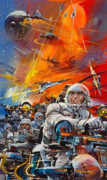 Curator: Woah, just woah. This thing just pulsates with optimistic energy. Like a sci-fi pep rally on Mars. Editor: You’re right, there’s an interesting retro-futurist sheen to it. What we’re looking at is “Space Settlement, AMP Corporate commission preliminary” by John Berkey, an oil painting from 1988. And while we are in the territory of fantastical design, the question for me is about accessibility, which is far from the case. Curator: Tell me about it. This mega-structure squats on a terraformed Mars. Everything is shiny and white with retro rocket fins and what looks like happy little transport buggies zipping around. A far cry from the gritty space operas of today. Makes you wanna book a one-way ticket, no? Editor: Maybe not. Consider the historical context. This was the late Cold War, anxieties about technological dominance. That gleaming white structure with the prominent U.S. flag. Who gets to live in this utopia? Are we thinking about indigenous populations or, for that matter, the working classes of Earth? It’s a narrative of progress but a progress perhaps exclusively for the few, a visual shorthand for capitalist expansion into the cosmos. Curator: I dig that, for sure. The dream always comes at a cost. Though I can't help but think that Berkey just got jazzed by shapes. It reminds me of those elaborate LEGO castles kids build—equal parts functional and gloriously excessive. Editor: Precisely. This intersection of architectural fantasy and national ambition. You can’t ignore the symbolism of a carefully crafted, master-planned Martian society when those ideas often mirrored inequalities back on earth. Curator: Still, I can get lost in the sheer craft here. It has that cool blend of technical drawing and sheer imaginative leap. And oil paint of all mediums... that makes it pretty grounded in its old fashion-ness. Editor: It's a complex picture isn't it? John Berkey's futurist vision certainly gives us pause to ask whether progress actually equates liberation. Curator: Yes, that retro vibe and underlying ambition has me thinking, maybe utopia is more about asking better questions down here.