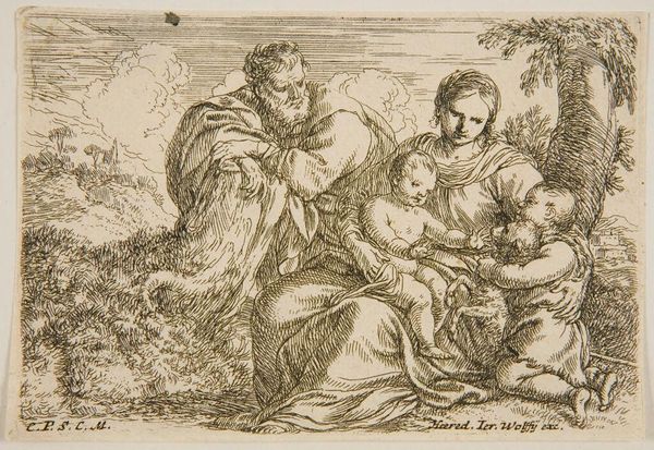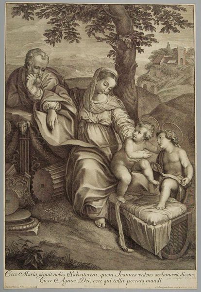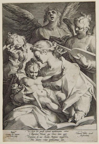 Curator: Here we have Sisto Badalocchio's "The Marriage of Saint Catherine," currently residing in the Harvard Art Museums. Editor: It's tiny! But densely packed. The crosshatching gives it a weighty feel, almost sculptural. Curator: Badalocchio, a student of Carracci, worked in a period where printmaking served to disseminate artistic ideas. This piece reflects the influence of classical antiquity, popular in academic circles. Editor: I'm intrigued by the labor here. The etching process, the precision... each line meticulously placed to build form and shadow. It speaks to a different kind of artistry than a quick sketch. Curator: Absolutely. And consider the socio-political implications: prints like this made art accessible, shaping public perception. Editor: It's like a miniature monument to the artistic processes of its time. Curator: Precisely. A small window into a much larger world of artistic production and dissemination. Editor: The piece carries such a depth of history within its modest size.