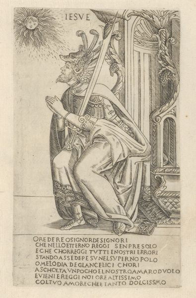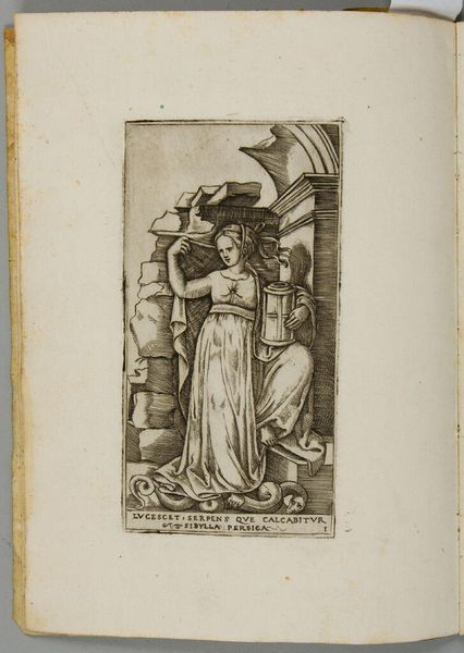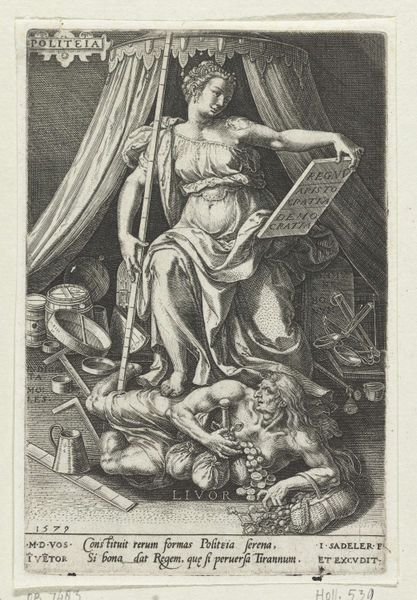 Curator: Good morning. We are standing before "Boosheid," an engraving made around 1575 by an anonymous artist and held in the Rijksmuseum collection. The work, rendered in the Mannerist style, allegorically depicts wrath. What's your immediate reaction? Editor: Well, immediately, there's a disturbing theatricality. The central figure is armoured but half-undressed, with what looks like a hellhound straining at the leash behind her, a very strange, disconcerting contrast. The architecture behind the main figure crumbles. Curator: It is an interesting portrayal. It reflects the era's use of allegory to convey moral messages, typical of the Mannerist movement. Consider how the engraving’s distribution as prints contributed to shaping socio-political values of the time by demonising anger and endorsing control. Editor: That control seems tenuous at best, given the backdrop of chaos. What strikes me is how "Boosheid" could be interpreted as an early commentary on gendered expectations surrounding anger, or the performance of gender altogether. A warrioress barely cloaked who has unleashed hell, yet at the same time restrained? Who is being controlled? And by what system? Curator: Such dualities were consciously embedded to emphasize that wrath unchecked leads to ruin. The setting does resemble classical ruins, alluding perhaps to political and societal collapses resulting from anger and irrationality. The print might serve to police behaviors amongst certain demographics. Editor: Or, subversive potential. Isn't there power in uncontrolled fury, especially for those marginalized by societal structures? I see it in a very contemporary context – a release against oppression. This isn't just an allegory about the perils of anger; it's about how suppressed rage finds expression. Curator: An interesting position. Yet, the detailed armor, the symbols...all were quite deliberately constructed to convey particular meanings understood by the viewers of the time, even if we can look at those symbols anew. Perhaps art can be seen as reflecting or creating these frameworks within the socio-political systems, where values and beliefs could be performed, interpreted, and renegotiated. Editor: Absolutely, I appreciate your emphasis on the agency of audiences, though I'm still fixated on that dog, who is both captive and feral. Food for thought, for both of us! Curator: Indeed. A print to reflect upon, for many reasons, now as well as then.