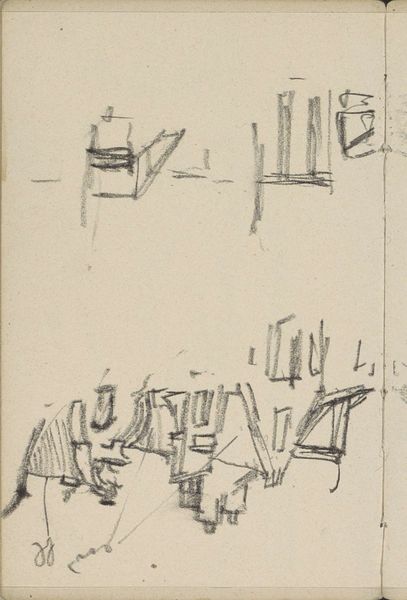 Editor: This pencil drawing is titled "Gezicht op de Kalverstraat te Amsterdam met de Nieuwe Kerk," placing us in Amsterdam between 1914 and 1923, captured by George Hendrik Breitner, and housed at the Rijksmuseum. There's an unfinished quality, an energy that reminds me of quick notes on a page. It feels spontaneous, but I’m wondering, what do you see when you look at it? Curator: It's a glimpse into Breitner's creative process, a hurried yet thoughtful embrace of urban life, as the title indicates, capturing the essence of Amsterdam’s Kalverstraat and Nieuwe Kerk, known as New Church. See how the lack of crispness almost vibrates with life. The sketch invites us to fill in the blanks, a collaboration of sorts, don’t you think? It isn't necessarily photo-realism but perhaps feeling-realism? Editor: Feeling-realism, that's interesting! So it's not about capturing exactly what was there, but how it felt to be there? Curator: Precisely. Breitner was known for his involvement with 'Amsterdam Impressionism', wasn't he? And in many ways, it is an attempt to portray a specific subjective impression as authentically as he can. Consider how radical this perspective was then, and in many ways still is today. It can feel rather empowering to embrace the unfinished! Editor: I never really considered 'unfinished' as powerful, but I do get a better sense now about how intention can still communicate even when a piece isn't completely fleshed out. Thank you. Curator: The pleasure is mine. Always lovely to unpack a 'feeling' and give it its due credit.