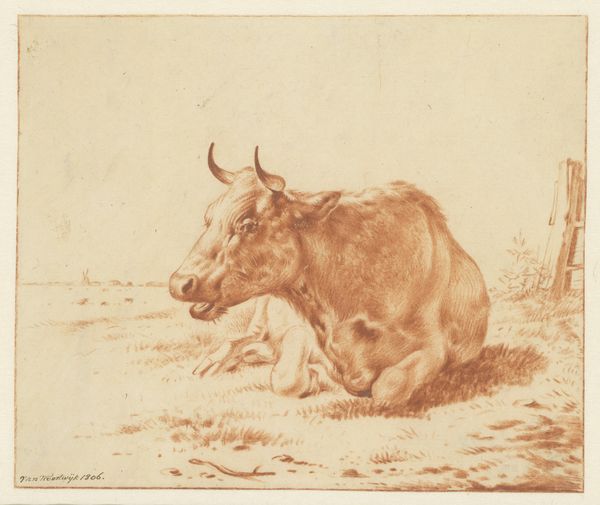Pieter Jan Guise made this drawing of a cow in the mid-19th century, using graphite on paper. Although humble materials, the artist's focus on a commonplace animal invites reflection on the processes of agricultural labor and the relationship between humans and nature. Guise's technique is key here. With sharp, controlled lines, he coaxes out the solid volume of the animal, the texture of its coat, the weight of its presence. You can almost feel the animal's warmth, its placid existence rendered with great sensitivity. This wasn't a quick sketch, but rather a sustained engagement with the subject, and with the craft of drawing itself. Ultimately, it is a reminder of the artistry and skill involved in capturing the essence of everyday life. It demonstrates how even seemingly mundane subjects, rendered with care and attention, can offer profound insights into our world.