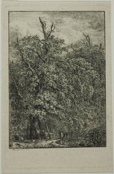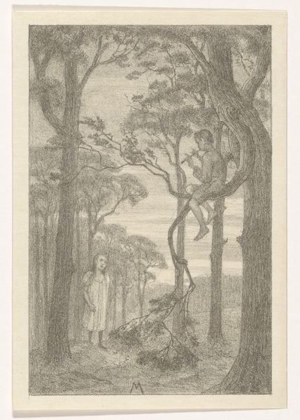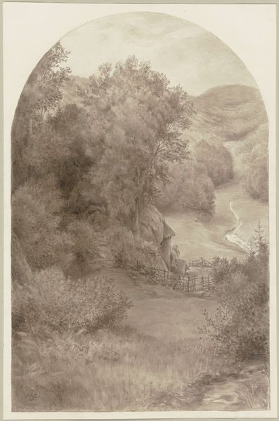 Curator: The work before us is a pencil drawing titled "Berglandschap met waterval en brug," or "Mountain Landscape with Waterfall and Bridge," created around 1901 by Simon Moulijn. It's currently held in the collection of the Rijksmuseum. Editor: Wow, it's like a memory fading into existence. The muted tones of the paper make the landscape seem ancient and delicate. A gentle melancholy washes over me looking at this quiet scenery. Curator: The drawing offers a fascinating glimpse into the late 19th, early 20th-century artistic focus on naturalism and landscape. One could argue it romanticizes the rural, potentially masking the socio-economic realities of those living within such environments during the Industrial Revolution. Editor: I see your point, but honestly, I am just taken by the little details. The tiny waterfall almost hidden amongst the trees, the crooked little bridge daring you to cross. It’s all rendered so meticulously with such a delicate touch using a humble pencil! Curator: Absolutely, the technical skill is evident. And within the light pencil work and overall composition, we see not only a commitment to realism, but also a conscious aesthetic choice that may reflect broader social or philosophical attitudes toward nature during the period. Consider the potential impact of burgeoning environmental movements on artists like Moulijn. Editor: True. Still, standing here, I am wondering what it felt like for him, pencil in hand. Was he seeking a peaceful escape or trying to capture something disappearing before his eyes? Was his attention captured by similar themes as those he used a medium to present? So many questions. Curator: Which are precisely the sort of questions we must continually engage with. This work, like many landscapes, isn't simply a depiction of scenery. It’s a site where ideas about nature, progress, and perhaps even national identity, become visually articulated. Editor: You've given me much to ponder concerning art history and the wider context, yet it has given me a beautiful sense of escapism and wonder today, which, at its essence, may also be part of the artist's intent. Curator: Indeed, perhaps our interpretations—rooted in both historical understanding and personal experience—can mutually inform each other.
