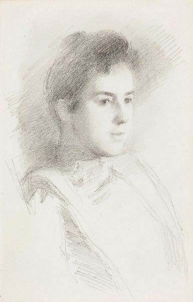 Editor: This is "Portrait of Sophie Aminoff" by Magnus Enckell, a pencil drawing. It has a rather serious tone to me. I'm curious, what draws your eye when you look at this portrait? Curator: The intensity of her gaze. Consider how Enckell uses pencil strokes to build not just form but also psychological depth. It's more than a likeness; it feels like an attempt to capture something essential about Aminoff’s inner self. Notice the deliberate use of light and shadow around her eyes—what might that signify? Editor: I guess it amplifies her direct stare, maybe suggesting intelligence or defiance. What would a portrait like this have communicated to its original audience? Curator: Portraits of this era were often charged with symbolic weight. The sitter's posture, clothing, even the background could convey messages about their social standing, character, or aspirations. The slight asymmetry, combined with the intensity I spoke of earlier, pushes back against convention. It gives us a window into Aminoff as an individual rather than a representation of an ideal. What emotions do you see reflected in her face? Editor: I can sense a sort of melancholy, maybe even a hint of guardedness. The slight blush on her cheeks adds a touch of vulnerability, almost hesitant, which contradicts her forward gaze. Curator: Precisely. The portrait operates on multiple levels of visual and emotional communication. The blush you pointed out and direct eye contact carry many meanings. Thank you for pointing it out to me! Editor: It is a striking and complex image, and I learned so much more than I expected from considering these features. Curator: And I from you!