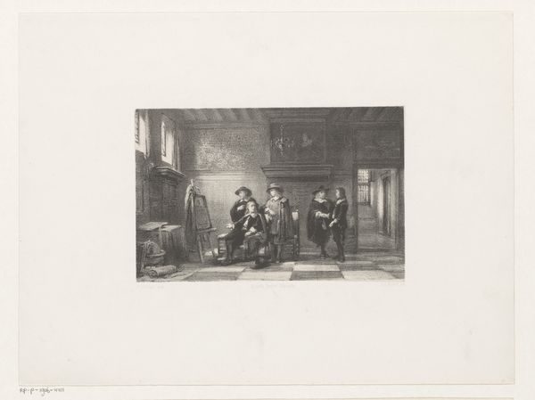 Jan Mesker made this etching, 'Inn with figures,' in the Netherlands sometime in the mid-to-late 19th century. It depicts a group of men relaxing in what appears to be a tavern. Images of everyday life like this were gaining popularity, reflecting a growing interest in the common person as a subject worthy of artistic attention. At the same time, the etching was establishing itself as a medium of choice for artists looking to make their work available to a wider public. In the 19th century, the art world was becoming more institutionalized, with museums and art schools playing a larger role in shaping taste and artistic production. Artists like Mesker often found themselves navigating these new structures, trying to balance their artistic vision with the demands of the market and the expectations of the art establishment. By looking at period publications, exhibition catalogs, and other archival materials, we can learn more about the social and institutional forces that shaped Mesker's work and the art world of his time.