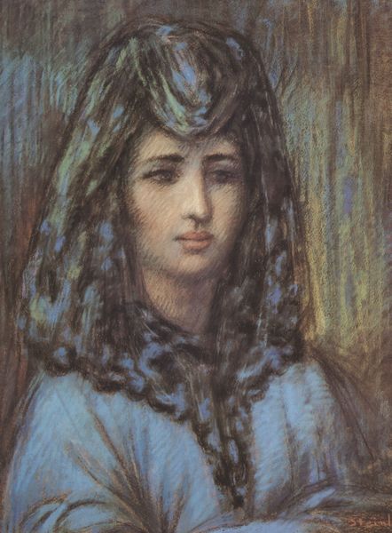 Pascal-Adolphe-Jean Dagnan-Bouveret created this pastel drawing titled "Madonna" during a time when traditional religious beliefs were being re-evaluated in the face of modernity. The Madonna, often depicted as the epitome of purity and maternal love, is rendered here with a subtle yet affecting gaze. Dagnan-Bouveret captures a sense of contemplative introspection. The use of pastel softens the features, creating a dreamlike, intimate atmosphere that invites a personal connection. Rather than presenting an idealized figure, this Madonna seems to represent a more human, accessible vision of faith. The artwork transcends traditional religious art, touching on themes of inner peace and the search for meaning in an era of great social and intellectual change. In this way, the drawing acts as a mirror, reflecting the shifting spiritual landscape of the time.