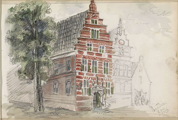 Curator: This work, by Isaac Gosschalk, offers a glimpse into 1866 Amsterdam, titled "Panden aan de Nieuwmarkt te Amsterdam". The rendering uses pencil and watercolor. What's your immediate take? Editor: It strikes me as both precise and ghostly. The skeletal structure on the left has such stark, linear clarity. But then, that wash of pale color, like a faded memory, adds an emotional weight. Curator: Exactly. It's the detail alongside the incompleteness that fascinates. That precision speaks to the importance of architectural representation at the time – how cities documented their changing skylines. But those incomplete parts... they evoke the transient nature of urban life. Editor: The "Billiard" signage hints at the burgeoning leisure activities taking place at the time, that moment where the Nieuwmarkt shifts to this commerce space where folks gathered and socialized. Also, there's a stage set to the side. It’s subtle but gives us so much info. Curator: Interesting. A lot can be made of it as well. Billiards wasn’t just leisure, though, for some it represented moral decline because it can be associated with gambling, which takes on a whole different meaning than simply leisure. Editor: So, those incomplete parts. Are they suggesting fragility, perhaps? That the prosperity wasn’t necessarily long-term? Curator: It suggests more than simple "fragility," for I see the ghost buildings also functioning as mnemonic devices. If you look, the windows form these very distinctive grids—patterns the public would use to remember and assign narratives of both prosperity and risk, like that potential moral failure you mentioned. Gosschalk invites us into their process of cultural association. Editor: A process we now inherit by simply observing his handiwork! He has inadvertently given the key to interpreting Amsterdam during the industrial period and what values are on trial during this cultural shift. Curator: Precisely! He captures Amsterdam at the precipice of significant change, revealing what remains of a vanishing architectural landscape and pointing to future conflicts of a culture in change. Editor: It gives us pause about whether change is really “progress.” Thank you!