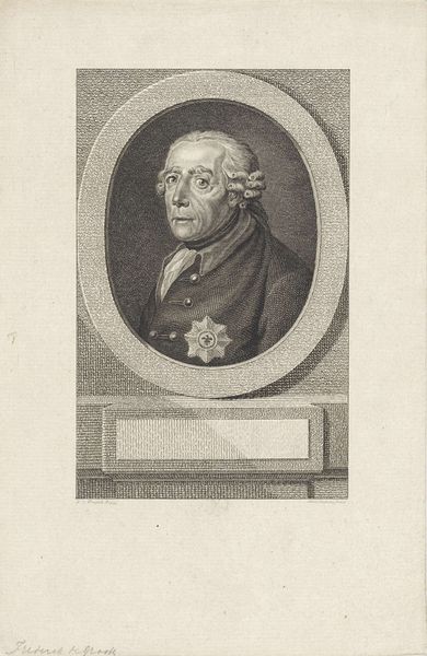 Hendrik Leffert Meyling created this print of King Frederick II of Prussia, capturing the essence of leadership through carefully chosen symbols. Encircling the king is an oval frame, a motif echoing ancient Roman portraiture, signaling power and authority. This recalls the Roman "imago clipeata", where portraits were framed within shields or circular forms, meant to evoke imperial strength and divine protection. But this symbol didn’t just appear out of nowhere; it evolves. In medieval times, we see similar framing in religious icons, conferring sanctity. The circle, an archetypal symbol of wholeness and eternity, subtly reinforces Frederick’s image as a timeless, enduring ruler. Note also his gaze: direct, unwavering, a projection of confidence. Such potent imagery doesn't just disappear, it is instead reborn, adapting to each age, bearing witness to the cyclical nature of history.