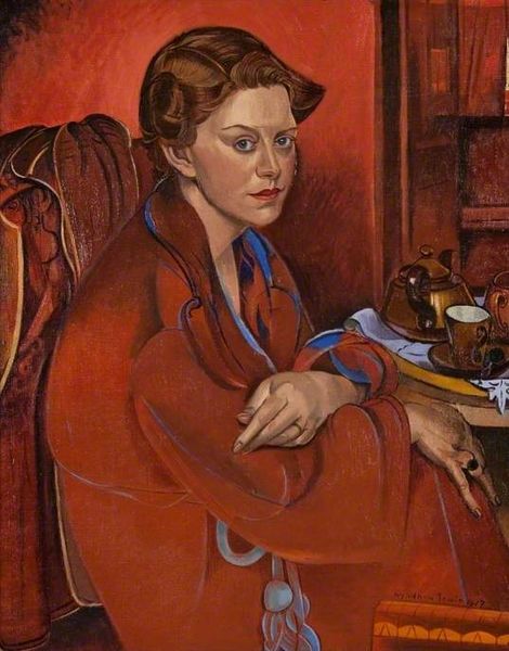 Editor: We’re now looking at “At a Sunny Window,” an oil painting by Ethel Léontine Gabain. It feels like a very intimate, personal portrait. What do you see when you look at this piece? Curator: Initially, the interplay of light and shadow arrests my attention. Notice how the luminosity flooding in from the window doesn't merely illuminate, but it sculpts the figure. Consider the deliberate tonal variations—how the verdant hues of her attire shift, morphing from vibrant to subdued as they recede from the light. Editor: So, the color and light are crucial. How does that create meaning? Curator: Precisely. Observe how Gabain uses the structural elements to direct our gaze. The composition invites us to contemplate the inherent formalism: the spatial relationships between figure, window, and the surrounding domestic sphere. Note also the brushstrokes—vigorous, yet controlled. This evokes a sense of immediacy. How does this formal approach affect your perception of the subject’s emotional state? Editor: It feels very much about capturing a fleeting moment. Like a snapshot of an interior life. I guess I didn’t notice the brushstrokes so much at first, but they do add to that feeling. Curator: The impressionistic touches definitely contribute to that affect. So, through the visual components—light, colour, and form—Gabain’s painting goes beyond representation, inviting reflection on the nature of observation itself. Editor: That makes sense. I've never thought so much about brushstrokes and light before. I can better appreciate how they're used to create meaning. Curator: Indeed. Hopefully you see the expressive power within its visual language.
