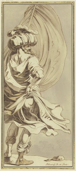 Editor: This is Claude Augustin Duflos le Jeune’s "Frame for a Dedication Plate," dating from somewhere between 1715 and 1786. It's a print, an etching and engraving on paper, currently held at the Metropolitan Museum of Art. It strikes me as a powerful, almost propagandistic image, even though it's “just” a frame. What do you see in it? Curator: I see a powerful statement about the relationship between power, knowledge, and representation. This frame, meant to glorify some historical figure or event, is itself an exercise in constructing that glory. The cherubs, the armillary sphere, the flags, the column: what do these symbols evoke for you? Editor: Well, the cherubs suggest innocence and divine favor. The armillary sphere… knowledge and exploration? Flags and columns suggest established authority. It feels like a very deliberate attempt to build legitimacy. Curator: Exactly. And within what social, cultural, and political structures was such authority built and maintained? What stories are being amplified here, and whose stories are being suppressed in favor of a singular narrative? Think about the Baroque and Rococo styles, the decorative-art aspects; those elaborate details weren't just aesthetic choices. Editor: They were a means of conveying wealth and power. This wasn't just about commemorating someone; it was about solidifying their place within a particular hierarchy, which, thinking about the dates, I suppose was aristocracy? Curator: Precisely! How does understanding that historical context change your interpretation of the artwork? Editor: It makes me see it as less celebratory and more…critical. Almost like an advertisement for power, not necessarily a reflection of inherent worth. Curator: It also becomes a tool for critically analyzing systems of power, isn’t it? The artwork almost asks, "Who benefits from this image?" Editor: Absolutely. Looking at it this way, I can never see a frame as *just* a frame ever again!
