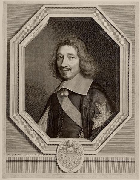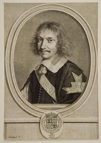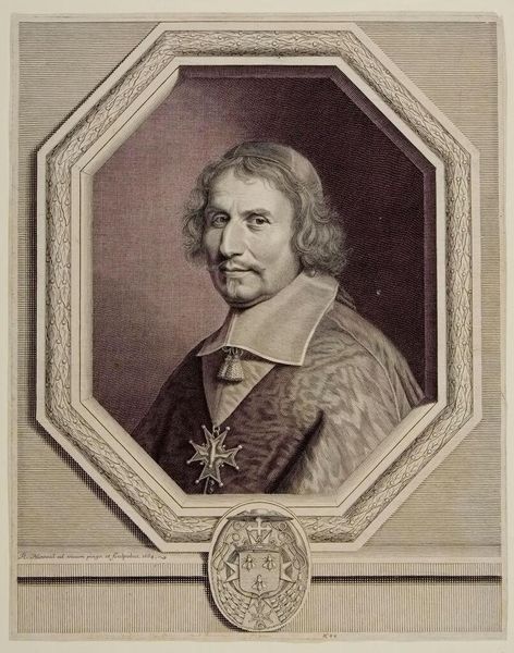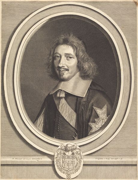 Editor: Here we have Robert Nanteuil's "Cardinal Barberini," housed in the Harvard Art Museums. It’s quite striking how the oval frame contrasts with the angular lines of the Cardinal's features. What catches your eye in this portrait? Curator: The technical virtuosity of Nanteuil's engraving is paramount. Observe how the density and directionality of the lines modulate to create tonal variation, defining form and texture without relying on color. The composition is structured through the interplay of light and shadow, creating depth within the oval frame. Editor: So, it's less about who Cardinal Barberini was and more about how Nanteuil depicted him? Curator: Precisely. The essence of the work lies in Nanteuil's masterful manipulation of line and form to create a compelling visual experience. The portrait transcends mere representation, becoming a study in the aesthetics of engraving. Editor: I never thought about it that way. Thanks for opening my eyes to a new way to appreciate this artwork! Curator: My pleasure. The beauty of art lies in its ability to evoke diverse interpretations.