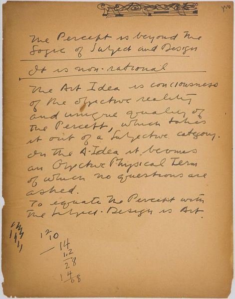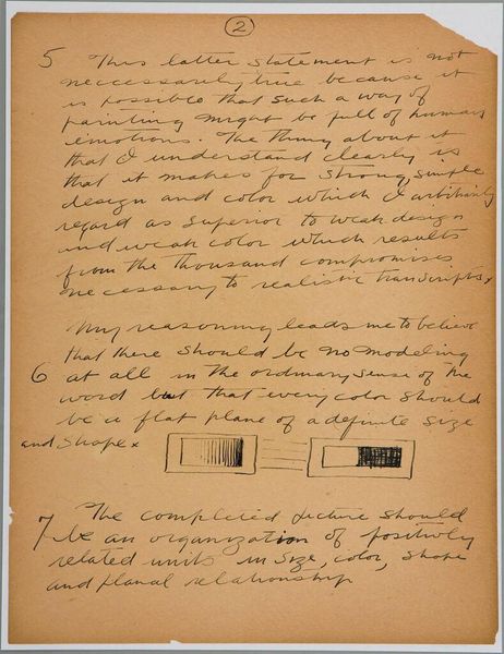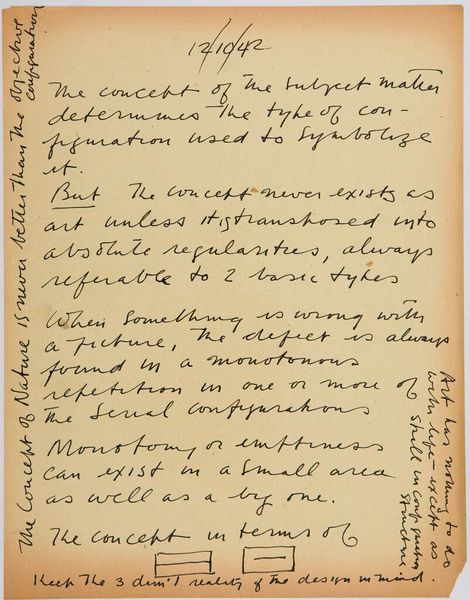 Curator: This handwritten page, "Art Theory Text with Types A and B Configuration Diagrams," from 1943 by Stuart Davis, is like a peek into the artist's mind. It's a fascinating jumble of text and diagrams on paper. Editor: I’m struck by how raw and immediate it feels, almost like a stream of consciousness. What do you make of Davis's "types" and "configurations"? Curator: I think he's attempting to dissect and codify the underlying structures that give rise to visual harmony, like a musician deconstructing a melody. It's a lovely thought, don’t you think? Editor: Absolutely, it gives new meaning to his colorful paintings. Thanks for sharing your perspective. Curator: My pleasure. It's always a joy to see these intimate glimpses into an artist's creative process.