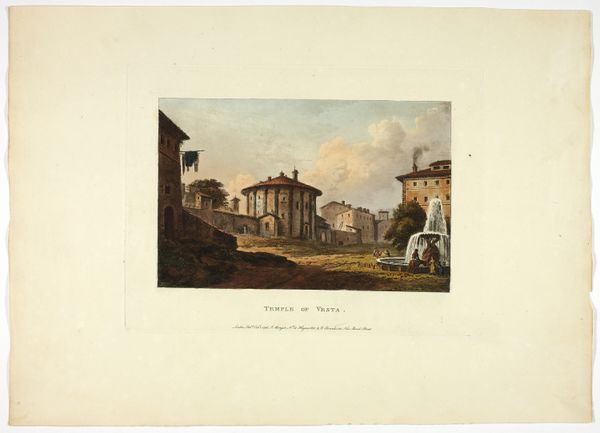 Curator: This is M. Dubourg's print "Arch of Septimus Severus, plate four from the Ruins of Rome," potentially created around 1897. It's held right here at the Art Institute of Chicago. Editor: It has a decidedly peaceful feeling. The soft watercolors give the hard Roman architecture a gentleness I wouldn't expect. Curator: Indeed. It showcases how the Roman empire becomes picturesque ruins to the late 19th-century eye. Consider the means of its production; prints like this were easily circulated, disseminating an idea of Rome and its history far beyond Italy itself. The paper and watercolor—materials readily available at the time— democratized access to classical imagery. Editor: That's a fascinating point. These ruins became cultural exports. You see that dome in the background—almost certainly a later Christian addition. So, what we are really observing isn’t simply the “pure” form of antiquity, but later repurposing. These ruins become a stage for constant ideological re-negotiations! The city itself acting as canvas for new narratives. Curator: Precisely. And look at the seemingly casual addition of figures at the base. How that seemingly simple decision impacts its reception is paramount. It's not just a monument; it's a lived space. These figures also indicate scale, and therefore grandeur. The arch and its stones have a material reality tied to extraction and construction. Editor: And destruction, and subsequent artistic production, such as we are contemplating now. These prints shaped collective memory and understanding of Rome. Think about who commissioned such pieces, who consumed them, and the power dynamics at play in shaping that historical narrative. How the act of drawing or printing this served specific cultural functions. Curator: Yes. I suppose we could consider how that plays against our current digital reproducibility of imagery...but perhaps that’s another discussion for another artwork. Editor: Quite! Perhaps another time we can explore these nuances further.