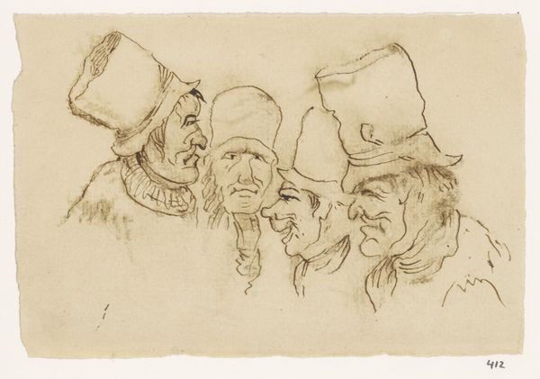 Editor: Okay, next up we have “Drie figuren,” or “Three Figures,” by Johannes Tavenraat, made with ink sometime between 1870 and 1874. The drawing has a real energy to it, almost like a quick sketch capturing a fleeting moment. What catches your eye in this piece? Curator: Well, it *does* feel incredibly spontaneous, doesn’t it? Like a visual diary entry. Tavenraat's choice of ink, so raw and unforgiving, really lends itself to that impression. Notice how the hats become these almost comical extensions of their personalities. Makes you wonder what kind of social scene he was trying to evoke…almost a bit like a Rembrandt on caffeine! What kind of story do *you* imagine is unfolding here? Editor: That's a great point about the hats. I guess they seem almost caricaturish, which adds to the sense of it being a snapshot of everyday life, maybe a bit satirized. I was focused on the textures, the roughness of the ink strokes that feel modern somehow. I think it makes me wonder, were the caricatures considered cutting edge back then? Curator: Exactly! He was capturing a certain kind of person, a certain attitude perhaps. It does remind us to question assumptions, doesn’t it? That directness, that slightly unflattering portrayal, is pretty powerful stuff. How does this affect your interpretation of Tavenraat as an artist? Do you see him as observational, or is there a judgmental element at play? Editor: Hmmm. That really makes me think about his intention, if he’s more observant or critical. It's tough to say for sure, isn’t it? This definitely gives me a fresh view of this drawing; the figures almost seem less like subjects, more like active participants in some untold tale. Curator: And there it is. The beauty, isn't it? Art’s endless invitation for storytelling, with us right in the centre of it. Editor: Totally. So much for a simple drawing; turns out it’s more of a novel!