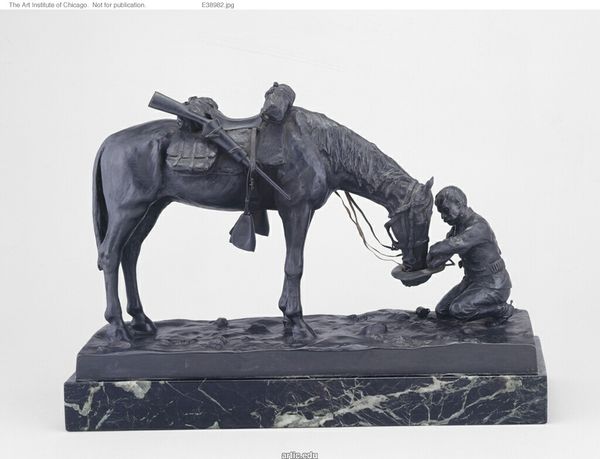 Editor: Here we have Frederic Remington's bronze sculpture, "The Rattlesnake," dating roughly from 1905 to 1918. There’s an incredible sense of action and tension; you can almost feel the horse's panic. What stands out to you in this piece? Curator: The drama certainly leaps out. Remington has captured a pivotal moment, hasn't he? This work isn't just about a cowboy and a horse; it evokes something much older. Notice how the horse rears back – an instinctive fear response. Consider the serpent as a symbol - in many cultures, it embodies chaos, danger, and a disruption of order. Editor: So, you see the rattlesnake as representing something beyond just a literal threat? Curator: Precisely. Think of the Garden of Eden, of primal fears. The cowboy’s reaction, his desperate grip, is almost secondary. Remington is tapping into this deep-seated, almost universal recognition of unseen, hidden danger disrupting the perceived harmony of the world. And in early 20th century America, wasn't there a palpable anxiety about disrupting old ways of life and encountering hidden threats? Editor: That makes so much sense! It is so interesting how Remington uses this simple encounter to symbolize greater anxieties. The sculpture’s dynamism creates a lasting impression. Curator: Indeed, and the snake has an iconographic connection through centuries. Understanding its presence in this sculpture helps us decode how Remington's art speaks across time. I see something new every time I examine the emotional potency conveyed in its enduring symbols.