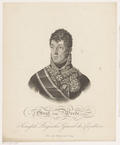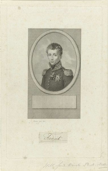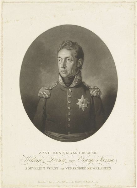 Curator: Allow me to introduce "Portret van Willem I Frederik, koning der Nederlanden," or, Portrait of William I Frederick, King of the Netherlands. This engraving, made sometime between 1815 and 1899 by Martinus van Looyen, depicts the Dutch monarch. Editor: Well, he certainly looks…stern. The monochromatic palette really amplifies the gravity, doesn't it? Almost as if the weight of a kingdom is resting squarely on his rather serious shoulders. It is all so precise, giving the figure and especially his gaze an intense focus. Curator: Indeed. Engravings, with their meticulous lines, often aim for that sense of unwavering authority. William I, after all, was a figure of considerable power and the piece serves as an idealized and lasting visual marker. The oval framing suggests continuity with classic portraiture traditions of royalty, reinforcing that image of leadership. Editor: That's a good point about that frame—it’s sort of sealing him in as this…icon, almost? But there's a funny juxtaposition with the subject's clothing: so opulent and decorated on top, and then just a bare minimum underneath a midriff concealing stripe of fabric. Almost feels at odds, like there is only budget to represent authority from the chest upwards. Curator: Think about what these emblems represented at the time. Consider, for example, the prominent star emblem, that is included alongside epaulettes: visible signifiers of royal order, strength and leadership that reinforced the perception of stability at the dawn of a new Dutch kingdom after the Napoleonic era. Editor: Which begs the question: stability for whom? And at what cost? Looking at the way he is posed, something is telling me that there would likely be limited interest from the subject towards hearing my perspective. But it still speaks loudly: perhaps to an ideal that might not entirely mesh with reality, then or now. Curator: Precisely! Visual communication, especially in portraiture, always involves choices that support a set of beliefs. Van Looyen, as an artist, would have understood that. That is also communicated with that inscription written into the bottom half of the artwork, an extra layer adding depth to the meaning making that sits squarely inside the piece. Editor: Definitely makes you think about the stories these official portraits deliberately leave out, doesn't it? It’s funny how a stiff monarch can open up a whole world of historical reflection! Curator: Indeed. A tiny, somewhat obscured window opens and then suddenly the room has been entirely reconfigured.