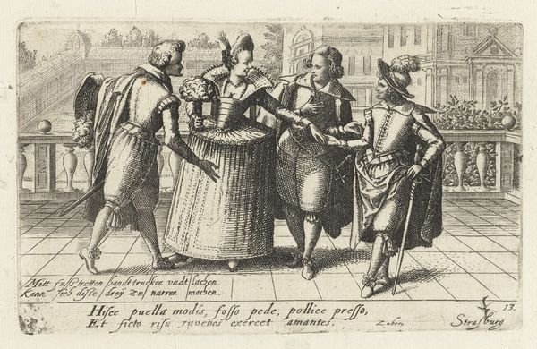 Curator: This engraving, "Joodse koopman, priester en een Jezuïet proberen een vrouw hun gedachtegoed en waar te verkopen" – which translates to “Jewish merchant, priest, and a Jesuit trying to sell a woman their ideas and wares"– was created by Jacob van der Heyden in 1608. Editor: It immediately strikes me how crisp the lines are for such an old print. And what an odd composition—the stark checkerboard floor almost seems to push the figures forward. Curator: The composition does more than just aesthetic work; the setting places this scene of attempted persuasion within a larger social commentary on religious and economic influences. What roles do these male figures represent? And what does it say about the status of women that each wants to "sell" to her something? Editor: If we focus on the structure, you'll notice the almost symmetrical grouping around the central female figure, drawing your eye right to her face. Her expression is wonderfully ambiguous, isn't it? Curator: Yes, there’s an undeniable power dynamic. Notice the way they each offer her a different object: a rosary, a contract, trinkets… These symbols embody systems and societal powers that exert a continuous pressure. How much autonomy does the woman have in this exchange? Editor: The formal balance does lend to a feeling of entrapment. I hadn't quite seen it that way initially. However, when viewing each item through the perspective you've offered, the reading changes: The density of the black ink used for their clothing further conveys weight. Curator: And that weight is, quite literally, a historical one, reflective of societal and cultural impositions during the Baroque era. Think about the witch trials and economic shifts...this scene embodies so much! Editor: Indeed. Seen as a formal piece, it’s a study in contrasts, but analyzed through a sociohistorical lens, a narrative unfolds, and layers of commentary become so interesting! Curator: Exactly! Appreciating it through an intersectional lens makes this piece far more meaningful. The print provides an immediate look into these 17th-century dynamics!