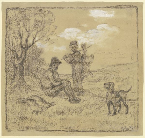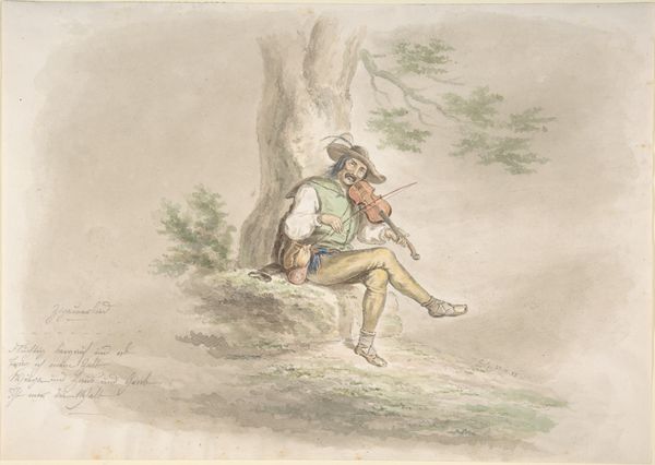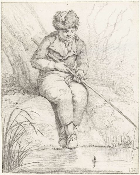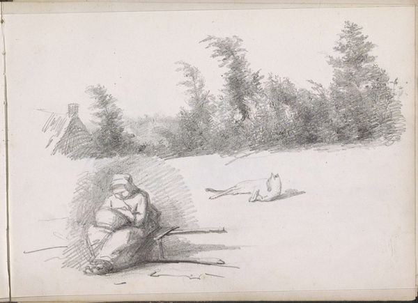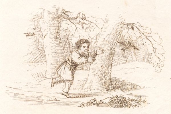 Curator: A curious drawing, all in sepia tones. An outdoor scene where a man seems to be resting by the roadside. The artist's light and quick rendering creates a hazy, dreamlike effect. Editor: Quite right. Here we have Martinus Rørbye’s illustration dating back to 1834. The full title is “Illustration til ‘Halvhundrede Fabler for Børn’ af Hey,” which translates to 'Fifty Fables for Children'. Executed using ink on paper, employing both engraving and drawing techniques. A confluence of mediums, wouldn't you say? Curator: Indeed, a clever blend. The linear precision of the engraving contrasts nicely with the fluid lines of the drawing, creating a compelling visual texture. The subject, situated on the lower left quadrant, assumes a posture that leads one's eyes to the upper right, echoing and emphasizing a narrative reading. It's meticulously assembled, even though at first glance seems loose. Editor: I agree about the textures. Consider the socio-political landscape of 1834 Denmark. There was a burgeoning interest in national identity. Romanticism often looked back to a pre-industrial, simpler time, much like this resting figure and the gently agrarian setting. I see a subtle longing here, even in a piece made for children. What I think makes the work charming is Rørbye’s play on the contrast between the figure's repose versus what lies ahead of him, along the meandering path to the spire on the horizon. Curator: A compelling connection between the figure’s state of contemplation, and the infinite possibilities presented in the fable’s narrative space. What appears to be a mere pause transforms into a significant intersection between personal introspection and societal movement. Editor: Precisely! And let's not forget Rørbye's contribution to Danish Golden Age painting and his impact on shaping a national artistic identity. The fact this image served as an illustration for children is interesting: perhaps it can be seen as instilling the Romantic ideals in younger generations. Curator: A fascinating note on how form mirrors the subtle shaping of ideological perspectives. All brought forth through careful visual arrangement and symbolic association. Editor: So much to ponder indeed. Makes one want to read these fables again, doesn't it?