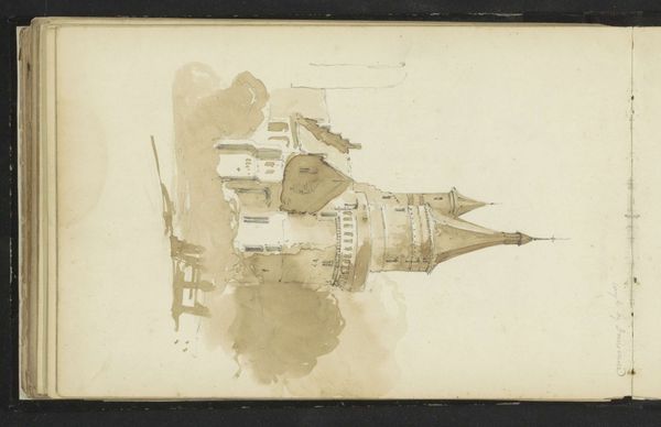 Curator: This is Johannes Christiaan Schotel's "Kade bij de Groothoofdspoort te Dordrecht," a drawing rendered in pencil and watercolor, likely created between 1797 and 1838. Editor: It feels... incomplete, somehow. The architectural elements are strongly defined, but the overall impression is dreamlike and faded, especially toward the lower half. It’s a very muted palette, dominated by greys and tans. Curator: Indeed. The composition utilizes strong verticals – the gate, the implied masts of ships. Note the artist's hand in juxtaposing the detailed architectural renderings with more loosely sketched nautical forms. It plays with the viewer's eye, shifting between precision and suggestion. Editor: The gate, especially—the Groothoofdspoort. Gates, throughout history, have acted as liminal spaces; they control the flow between outside and inside, chaos and order. Given Dordrecht's prominent role in Dutch history, it suggests power, defense, perhaps even a subtle note of anxiety about external threats. Curator: And the mirroring effect created by the water adds another layer, destabilizing the structure’s apparent solidity. The reflections aren't perfect replicas; they introduce subtle distortions that question the fixed nature of the architecture itself. Editor: Right. Water is, after all, a potent symbol of change and fluidity. In the cityscape, that stable human architecture encounters natural, mutable elements—hinting at the fleeting nature of even our grandest designs. It almost reminds me of Vanitas paintings, prompting meditation. Curator: Interesting. Consider, too, the absence of human figures. This enhances the sense of quietude, but also forces the viewer to inhabit the space, to become the implied observer in this moment in time. Editor: So, from a seemingly simple cityscape, Schotel presents us with considerations about transition and permanence, solidity and the shifting flow of time, all carefully balanced within the composition. Curator: Precisely. Schotel invites a deeper contemplation, through understated, technical mastery. Editor: It’s far more evocative than I initially suspected!