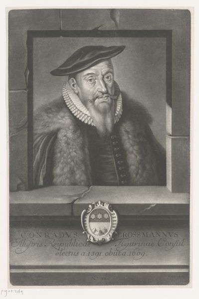 Curator: Here we have a portrait from 1779, once thought to depict Thomas Gresham, though the sitter's identity remains unconfirmed. Jean-Baptiste Michel executed this print, combining etching and engraving techniques, and it now resides here at the Rijksmuseum. Editor: It has this intriguing stillness to it. The way the light catches the intricate details of his sleeves creates almost hypnotic patterns. There's something profoundly sober and self-contained in the man’s gaze. He feels like a figure pulled directly from a history play. Curator: The piece speaks to the enduring appeal of portraiture and history-painting, which frequently blurred in Neoclassical prints, which aimed for posterity and a public role. Prints had great value, as their circulation shaped political discourse in revolutionary eras, for instance. The image would have offered viewers in that period insight, supposedly into the likeness of Thomas Gresham but regardless it participates in constructing the idea of historical importance through images. Editor: Absolutely! It's an object carrying stories and aspirations—hopes, or perhaps demands, that some figures persist in cultural memory. But it also begs questions about who gets remembered, doesn’t it? The fact that his identity is even uncertain introduces this great irony into it; the face we recognize isn’t even necessarily the person it’s meant to represent! Curator: It brings forward that concern in ways entirely unforeseen. Prints had an inherently democratic ambition through mass distribution, aiming for historical narratives accessible and tangible for broad publics. Errors could therefore also rapidly circulate... Editor: Maybe it makes the image even more compelling; it whispers of forgotten stories, misplaced identities, and all those unnamed faces that history overlooks, now eternally embraced by its narrative, despite all odds. I am really in love with the level of detailing to his clothing. Curator: Precisely. That initial attribution assigned a significance it never merited on its own, it shows how identities are molded, manipulated, and occasionally, just entirely mistaken through history's image machine. Editor: Makes you wonder about all those misattributed moments in our lives, doesn't it? This piece, so evocative yet so fundamentally uncertain, reminds us how fragile those narratives are.