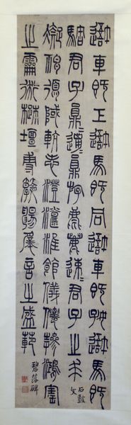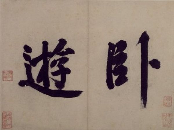 Curator: This artwork is called "Travel Poems", created in 1834, and is held at the Minneapolis Institute of Art. It's an ink-on-paper drawing, showcasing masterful calligraphy. Editor: It feels so immediate! The thick brushstrokes give it an energy, a real sense of the artist's hand moving across the paper. There's something very confident about the weight of the ink. Curator: Absolutely. The stark black ink against the paper creates a compelling contrast. Looking closely, we can appreciate how the material—the paper itself—is integral to this artwork. Think about the sourcing, the preparation of the paper, and the particular kind of ink used and how its production and trade reflect the cultural economy of the time. Editor: And think about the symbols! This isn't just writing; each character carries deep cultural weight. Calligraphy itself, as an art form, is a symbol of status and education. I'm particularly drawn to the way some of the characters almost resemble natural forms, like mountains or rivers – fitting for "travel poems," right? Curator: I'd also want to consider the historical context. Was this created for a private patron, a public display, or personal reflection? How might its meaning have changed depending on the viewer or the setting in which it was viewed? It's also useful to consider the cultural status of ink as material during the period it was created. Editor: Good point, the "travel" aspect surely held significant value during its period, where access and trade were more limited compared to our current context. The poem, rendered so beautifully, becomes a vessel for vicarious experience, a way to connect with other places and other lives. Curator: Indeed, and while the visual beauty is immediately captivating, thinking about the poem's meaning as it relates to social issues surrounding travel really grounds it for me. Editor: It really prompts thinking about not only travel through landscape but through time. It invites contemplation on the human experience, rendered through potent symbols, and exquisite control of a simple material: ink. Curator: So much for something initially appearing very straightforward and simple. Editor: Exactly, I see it slightly different after this conversation. Thanks!