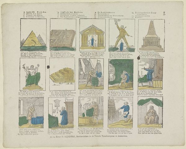Curator: This print, titled "Seven Wonders of the World and Important Inventions", dates from between 1806 and 1830. It's currently held at the Rijksmuseum. The artist, Gerrit Oortman, uses engraving to depict these historical wonders and, interestingly, contemporary innovations of the period. Editor: The print certainly conveys a sense of historical curiosity, a desire to classify and compare achievements. However, the compositions are so dense with detail, and the contrast so stark. Is that merely a characteristic of engraving, or do you find it adds meaning here? Curator: The detailed linework and monochrome palette are intrinsic to the engraving process. However, the visual effect echoes the Enlightenment's encyclopedic impulse: to record and understand through precise observation. The engraving technique lends a certain authority to the depiction. Editor: But how reliable is that authority? Each scene is presented in its own framed compartment, which creates a sense of disconnect. Does that serve to elevate each subject or compartmentalize our understanding of interconnected histories? Curator: Precisely! The artist offers us individual glimpses, creating a type of typology. By putting them side-by-side, Oortman proposes relationships or allows viewers to make connections themselves. It's an attempt to create visual analogies, highlighting similarities of engineering ingenuity. Editor: Placing those ancient wonders alongside more recent inventions—isn't that suggesting a progressive view of history, a narrative of constant improvement and advancement? That's very much a story of power structures too, how those achievements are connected to societal evolutions and changes. Curator: Indeed, one cannot deny how institutions can condition cultural change and shape how achievements are received. I can agree that social norms are mirrored here and speak of progress, science, and industrialization. The power dynamic in cultural creations makes the viewer question who created which technology. Editor: Well, I found it revealing to examine the framing techniques in tandem with each scene and how each depiction holds specific values depending on location, date, or artistic vision. Curator: And I was compelled by how Gerrit used material elements in the compositions as symbolic anchors of each wonder or invention, making a very visually rich experience.